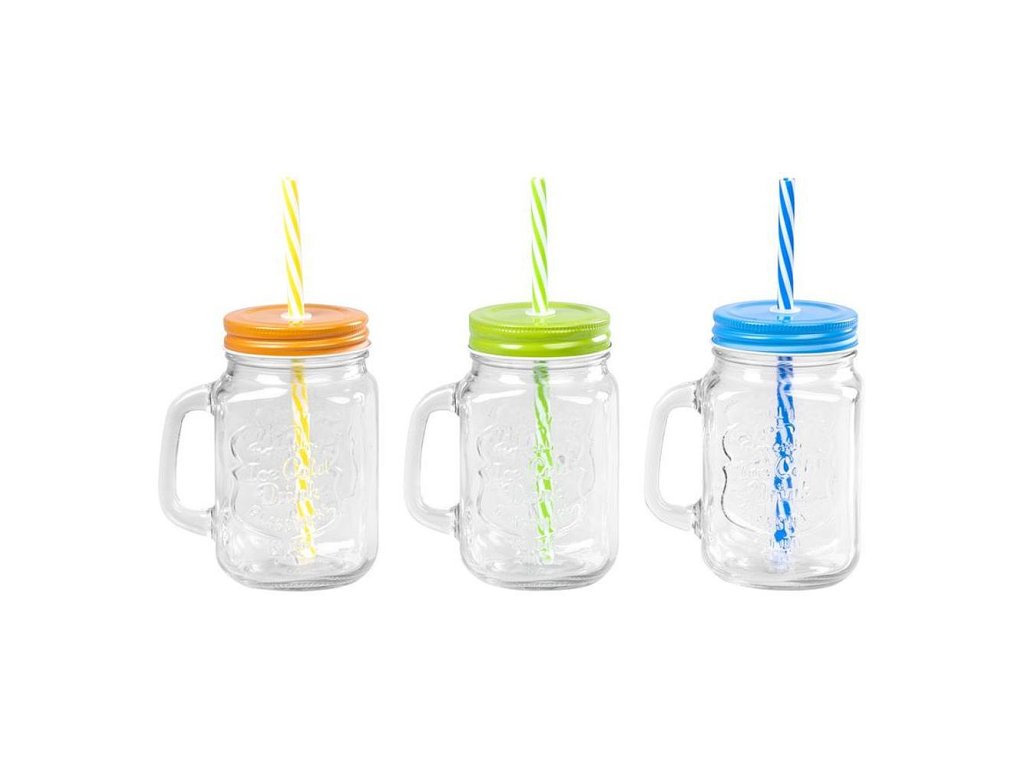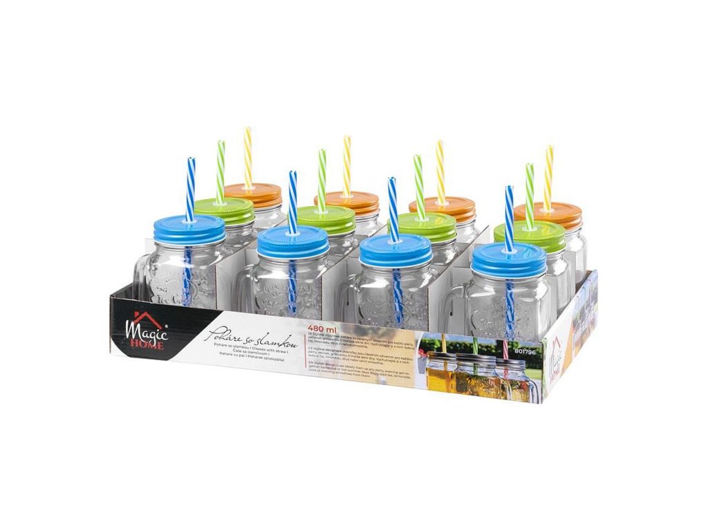 Sklenice s brčkem a barevným víkem MagicHome sklo, 480ml