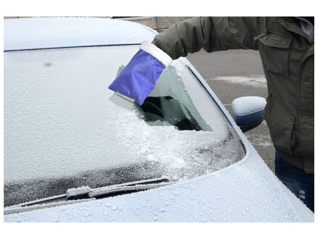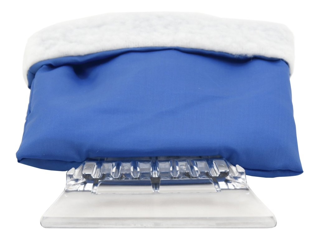 Škrabka s plastovým břitem v kombinaci s textilní rukavicí. Zamezuje prochladnutí ruky při čištění zamrzlého skla. Vnitřní strana rukavice s "kožíškem". Materiál plast + textil.