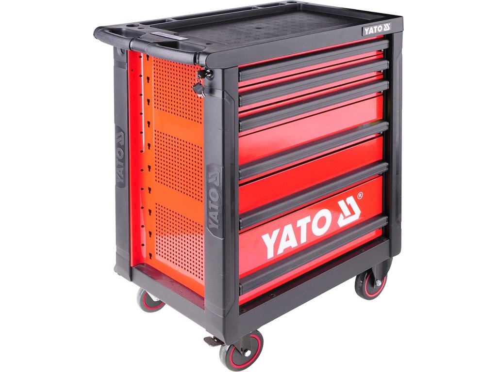 Dílenská skříňka značky YATO, vybavena 6 zásuvkami s kuličkovým ložiskem, 4 horní zásuvky obsahují 177 pečlivě vybraných nástrojů.