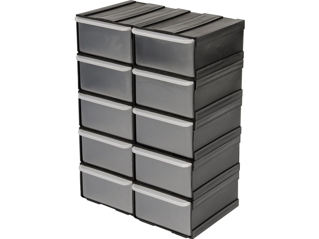 Dílenské zásuvky 22,5x15,5x10 cm. Určeno k uložení drobných předmětů, jako jsou drobné spojovací prvky, náhradní díly a nářadí. 10 zásuvek. Rozměry jednoho modulu: 7,8 cm (šířka) x 10 cm (hloubka) x 4,6 cm (výška). Užitečné doma, v garáži, dílně, skladu atd.