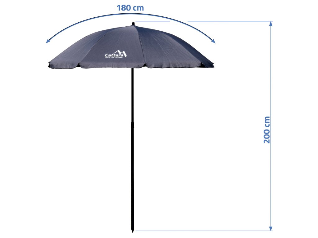 Průměr slunečníku je 180 cm a celková výška 200 cm. Dvoudílná konstrukce je skladná a lehce složitelná. Stačí do sebe zasunout obě nosné tyče a zajistit páčkou. Poté již stačí jen roztáhnout samotný slunečník. Konstrukce slunečníku má špičaté zakončení, takže je vhodná pro zapíchnutí do země.