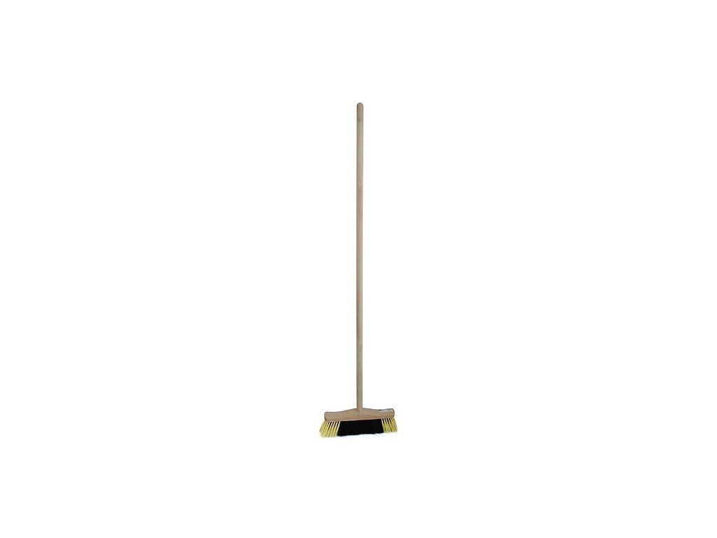 Dřevěný nelakovaný smeták, neštěpená syntetická vlákna PET, dřevěná násada na závit 120 cm, šířka smetáku 34 cm, šířka základny 30 cm.EAN 5907582523468