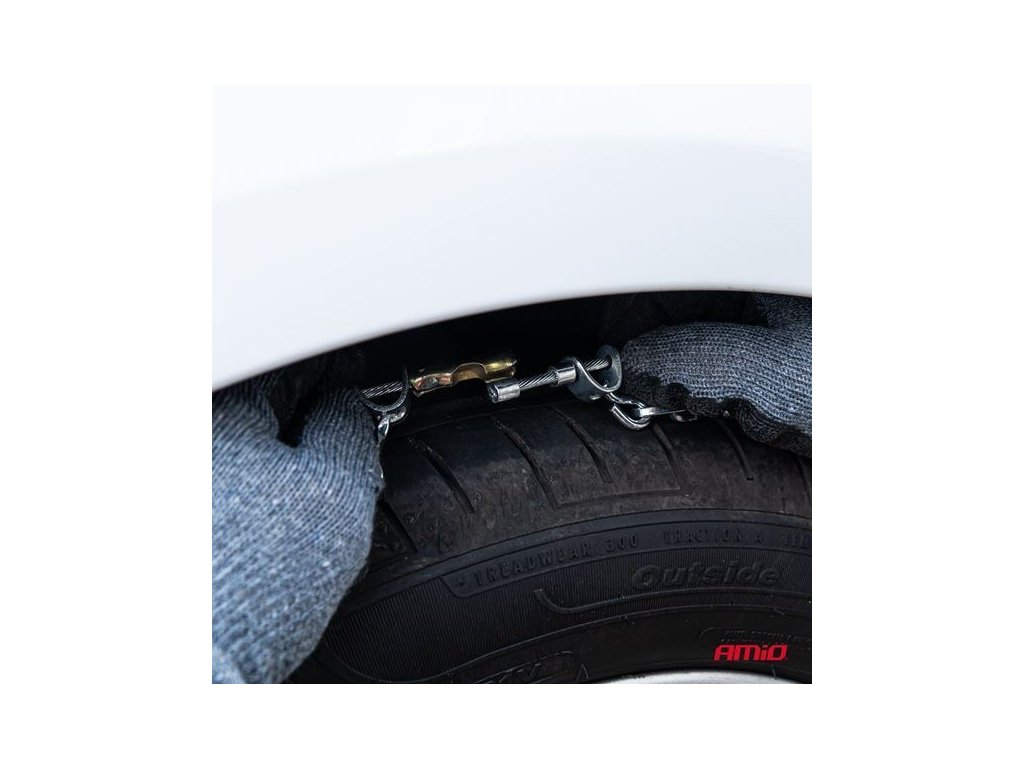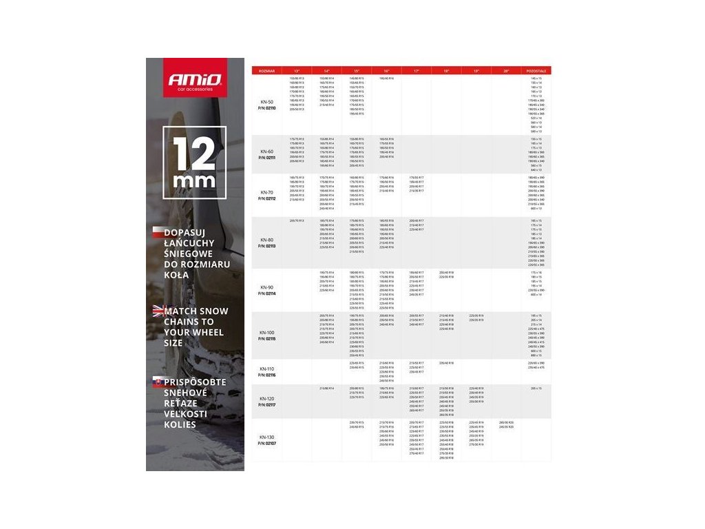 Sněhové řetězy 12 mm KN-80 AMIO Popis produktuŘetěz je vyroben z kalené oceli a má asymetrický vzor ve tvaru diamantu. To zlepšuje trakci kol na zasněženém nebo zledovatělém povrchu. Pevné články jsou 12 mm vysoké a mají čtvercovýprůřez.