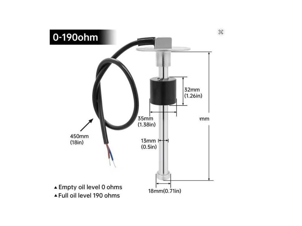 Snímač hladiny kapaliny v nádrži 200mm, 0-190ohm Nerezový snímač hladiny kapaliny. Při přázdné nádrži 0ohm, při plné 190ohm.K snímači možno použít budíky M351B, M351C, M351D