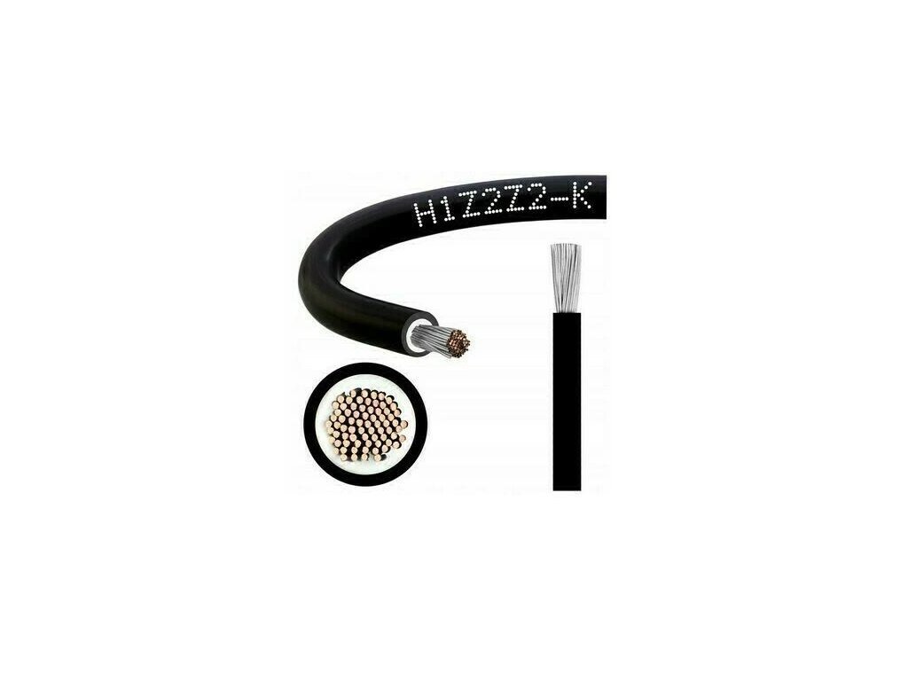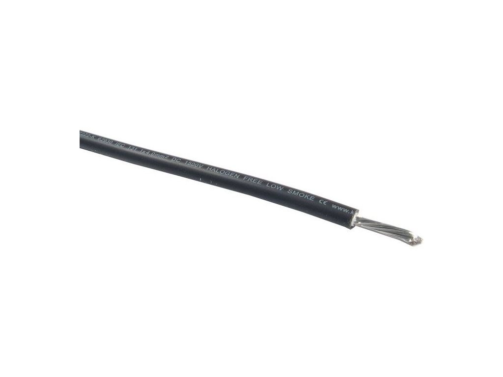 Solární kabel H1Z2Z2-K, 4mm2, 1500V, černý, balení 100m **Specifikace:** 54x0,3mm CuSn+0,7mm XLPE+0,8mm XLPE. Dvojitá izolace, elektrická pevnost 1500V, samozhášivá vnější izolace dle DIN60332-1-2, UV ochrana.Doplňkové parametry