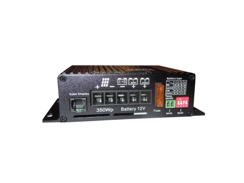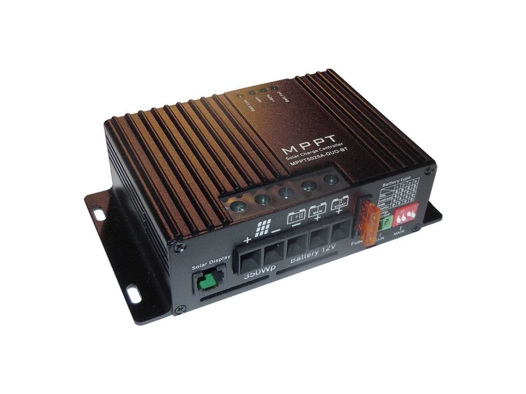 Solární regulátor MPPT5025-DUO-BT, 12V/25A pro 2 baterie Regulátor MPPT je primárně určen pro použití v obytných autech nebo lodích. Umožňuje připojení dvou nezávislých baterií, přičemž hlavní baterie (main I) je nabíjená většinou energie z FV panelů a druhá baterie, typicky startovací (start II) je udržovaná nabíjecím proudem max.1A, což zajistí dobrou kondici baterie i po delší odstávce auta. Pro hlavní baterii lze volit její typ i provedení, u druhé(startovací) baterie se předpokládá, že je olověná startovací, ale s ohledem na nízký nabíjecí-udržovací proud lze použít jakoukoli olověnou baterii (např.AGM) s kapacitou alespoň 50Ah. Regulátor umožňuje připojení adaptéru bluetooth s jehož pomocí lze monitorovat stav baterie na mobilním telefonu (aplikace ChargerConnect)**Specifikace:**