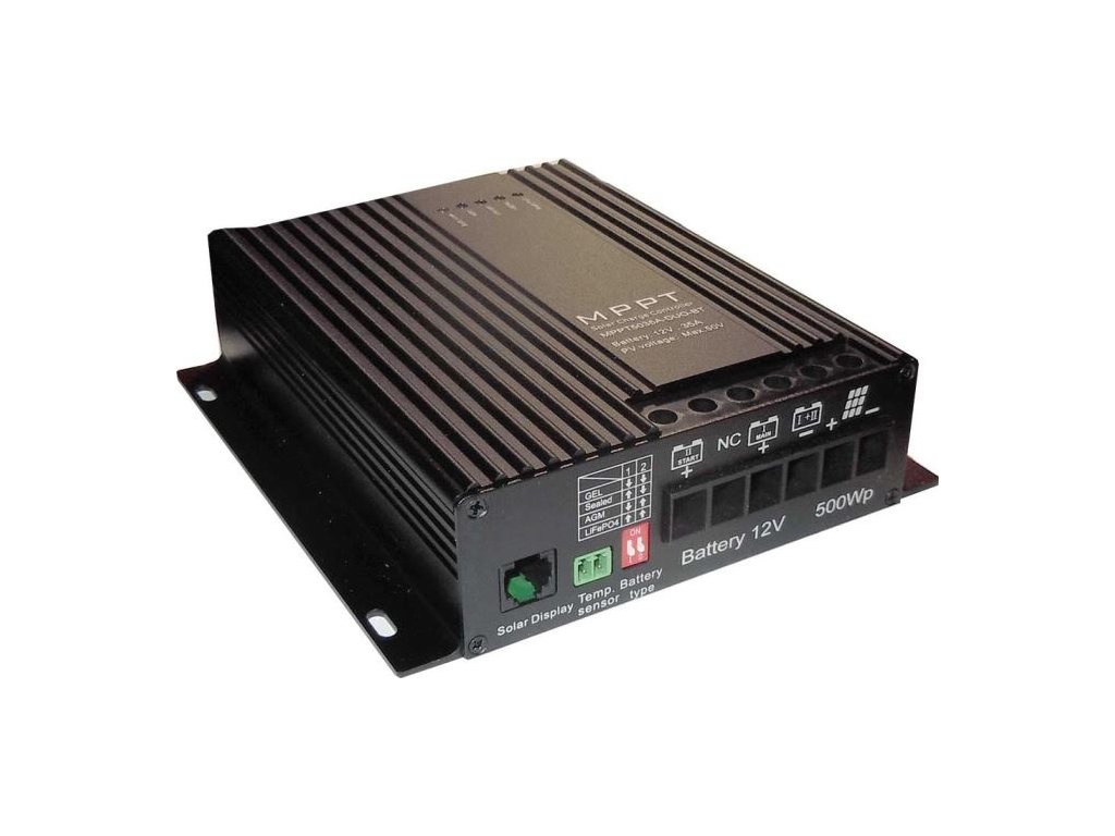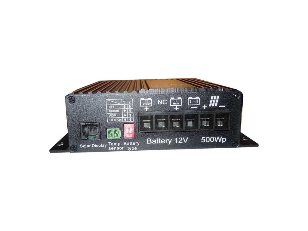 Solární regulátor MPPT5035-DUO-BT, 12V/35A pro 2 baterie Regulátor MPPT je primárně určen pro použití v obytných autech nebo lodích. Umožňuje připojení dvou nezávislých baterií, přičemž hlavní baterie (main I) je nabíjená většinou energie z FV panelů a druhá baterie, typicky startovací (start II) je udržovaná nabíjecím proudem max.1A, což zajistí dobrou kondici baterie i po delší odstávce auta. Pro hlavní baterii lze volit její typ i provedení, u druhé(startovací) baterie se předpokládá, že je olověná startovací, ale s ohledem na nízký nabíjecí-udržovací proud lze použít jakoukoli olověnou baterii (např.AGM) s kapacitou alespoň 50Ah. Regulátor umožňuje připojení adaptéru bluetooth s jehož pomocí lze monitorovat stav baterie na mobilním telefonu (aplikace ChargerConnect)**Specifikace:**