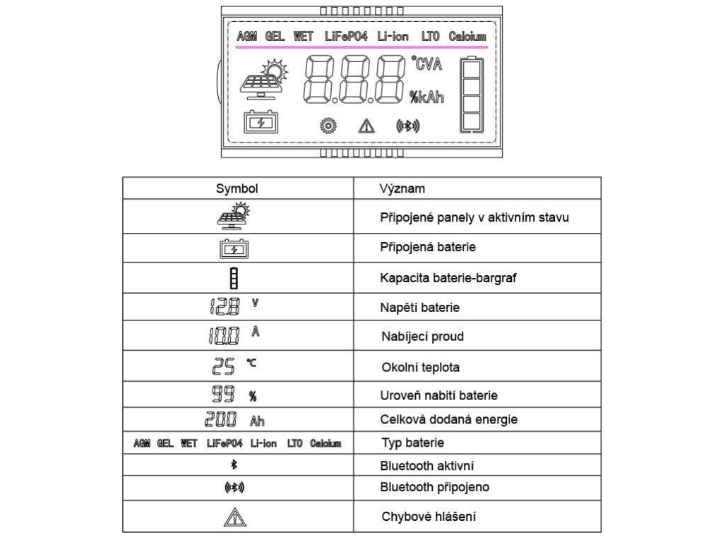 LCD displej s údaji o stavu a nabíjení baterie-viz.obr