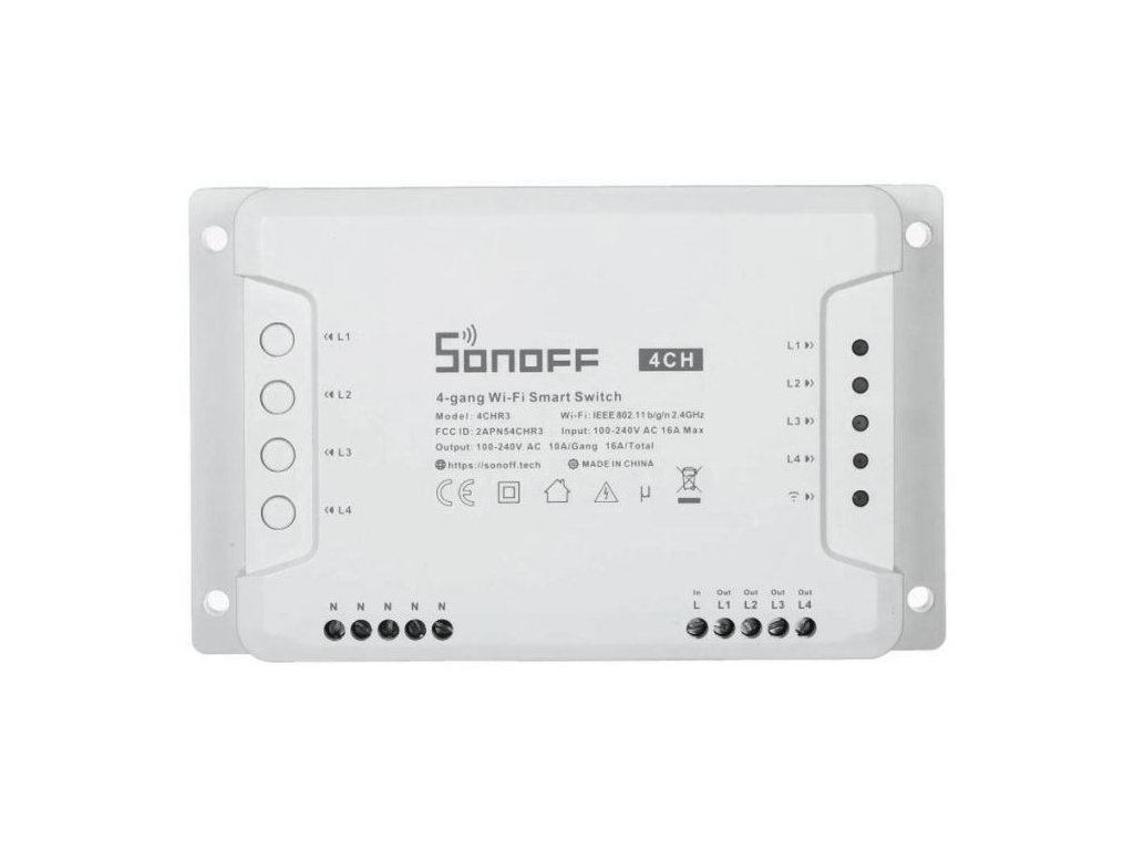Wi-Fi spínače Sonoff jsou určeny k ovládání elektrických spotřebičů vzdáleně přes internet. Využívají cloudového prostředí Amazon Web Services (AWS) pro zabezpečené připojení do internetu a ovládání pomocí připojené aplikace eWeLink z mobilního telefonu (Android i iPhone) odkudkoliv na světě. Aplikace eWeLink a služby spojené s provozem vypínačů jsou poskytovány zdarma. Napájení je řešeno přímo z230 V a výstupem (rovněž 230 V) lze ovládat spotřebiče až do zátěže 10 A. <BR/>**Remote ON/OFF - vzdálené ovládání 4 zařízení nezávisle na sobě** <BR/>**Podpora aplikace E-WeLink pro iOS a Android** <BR/>**Časové programování** <BR/>**Montáž na DIN lištu** <BR/>**Sdílení zařízení s jinými uživateli** <BR/>**Hromadné spínání a chytré scény** <BR/>**Hlasové ovládání - možnost integrace s Amazon Alexa, Google Home a pod.** <BR/><BR/>**Specifikace:** <BR/>90-250VAC, max.10A na kanál a současně max 10A celkově <BR/>WiFi 2,4GHz <BR/>WiFi Standard: 802.11b/g/n <BR/>WiFi zabezpečení: WPA-PSK/WPA2-PSK <BR/>Rozměry: 145x90x40mm <BR/>Pracovní teplota: 0°C - 40°C <BR/>Doplňkové parametry