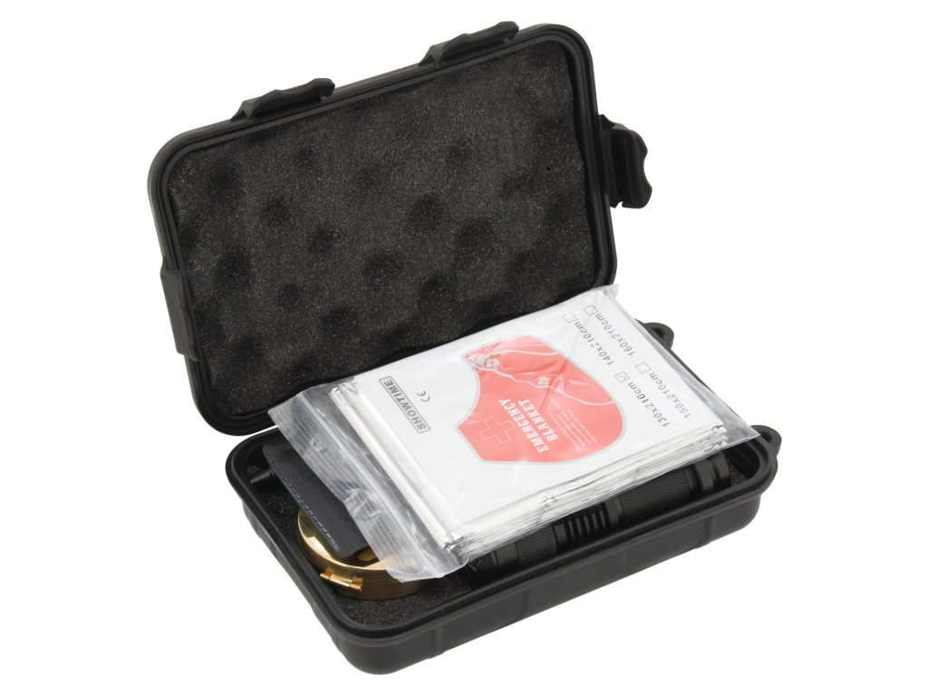 SOS sada je složena ze zavíracího nože s čepelí délky 6,5 cm, multifunkční karty, píšťalky, kompasu s otočnou stupnicí, bivakovací (izotermické) fólie, rozměrného křesadla pro zapálení ohně, přívěškem s LED osvětlením, celokovovým perem s průrazným hrotem a LED svítilnou napájenou AA baterií (není součástí balení) s nastavitelným kuželem vysoce výkonného světla. Vše je uloženo v ochranném, uzavíratelném pouzdře.