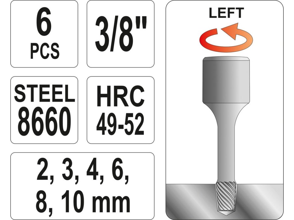 Zhotovení sady z kvalitní oceli 8660 s tvrdostí 49-52 HRC. Sada je přehledně uspořádána v plastovém kufříku.