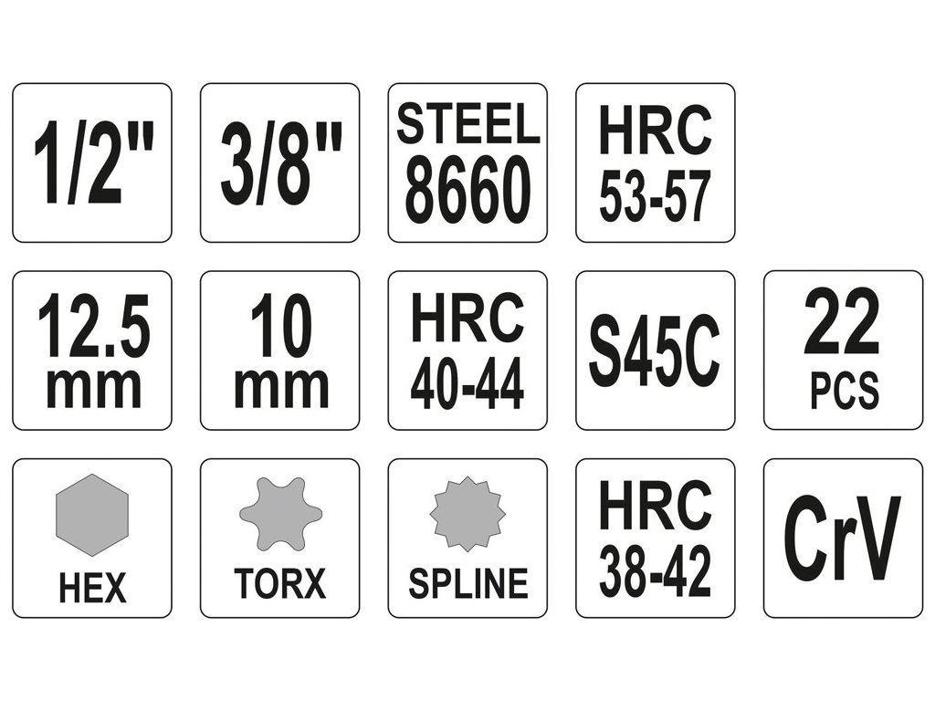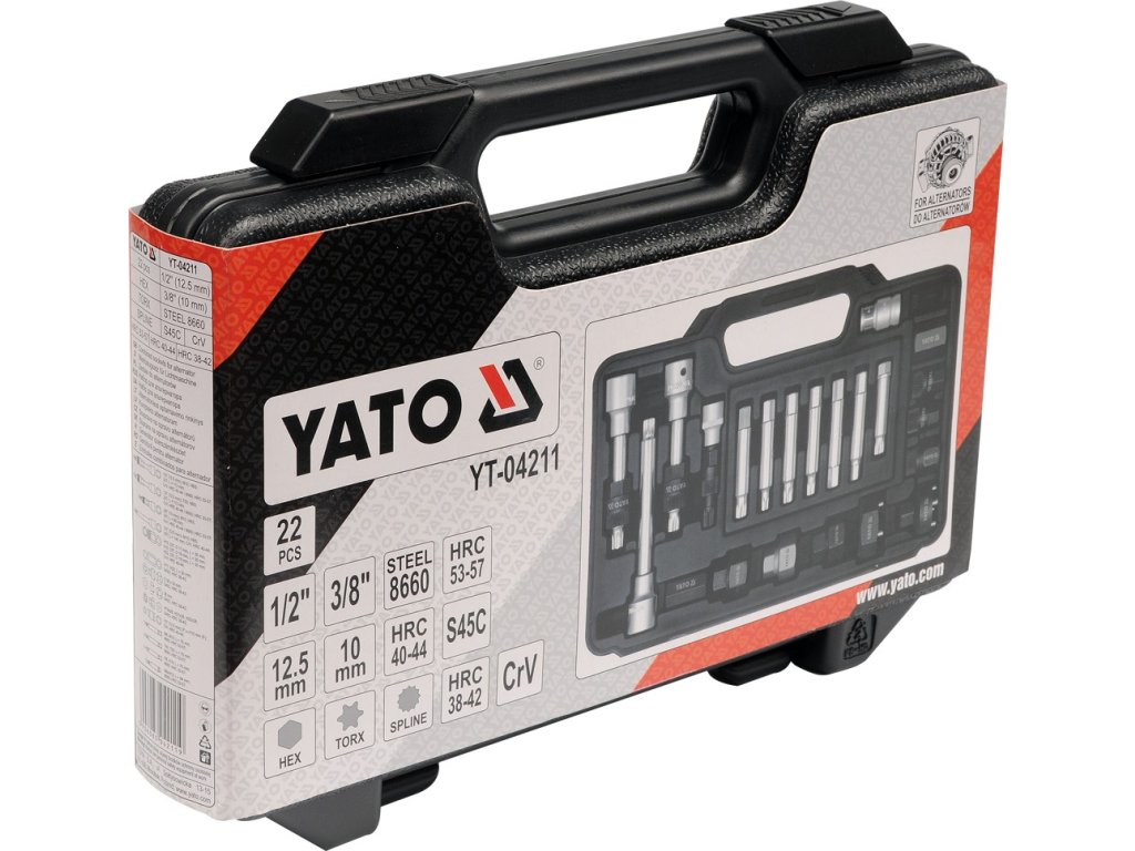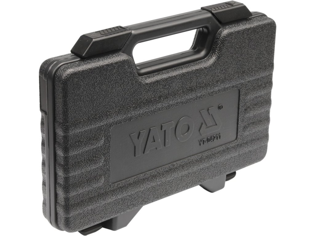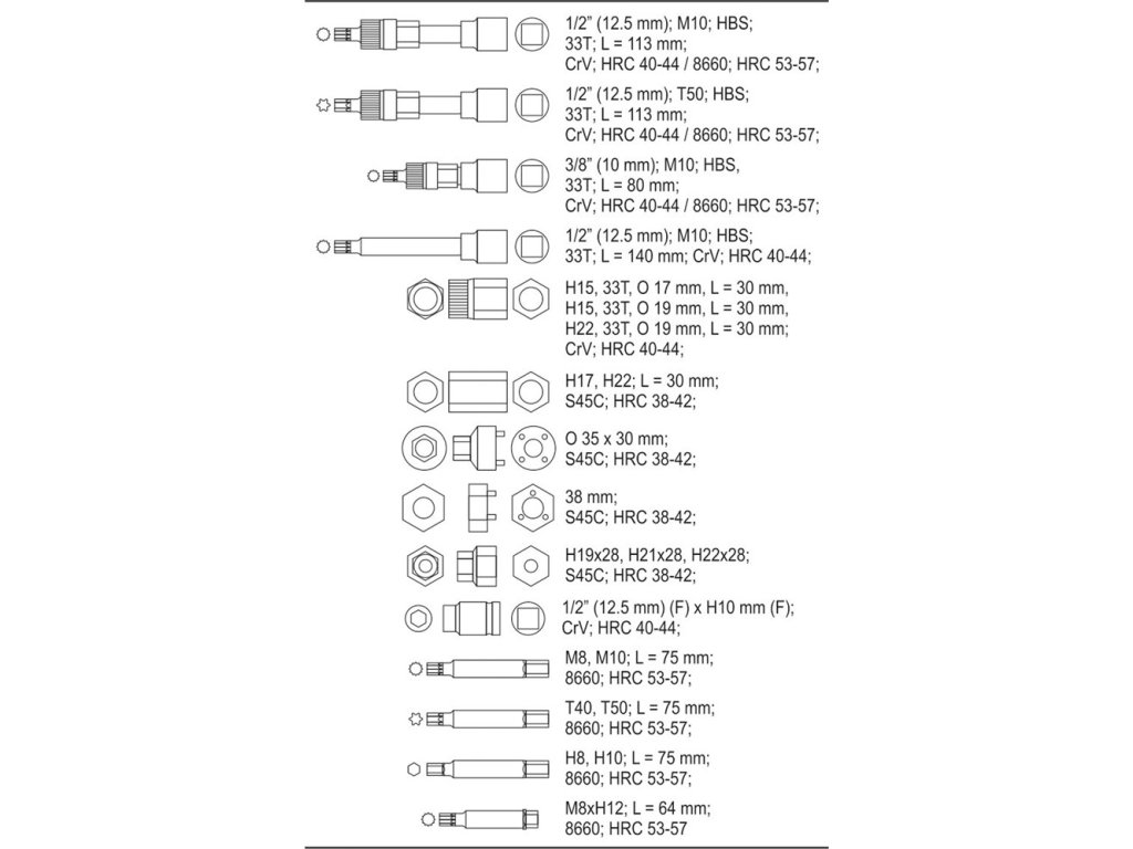Sada je přehledně uložena v kufříku a jednotlivé nástavce jsou velikosti 1/2" a 3/8".