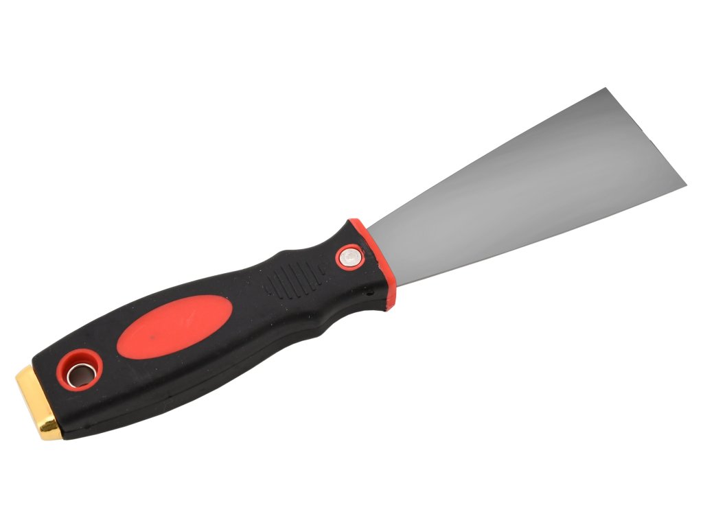 Špachtle (50 mm) z nerezové leštěné oceli s ergonomickou rukojetí a úderníkem, pokrytou dvěmi vrstvami barevného plastu různé tvrdosti zajíšťující pevný úchop.