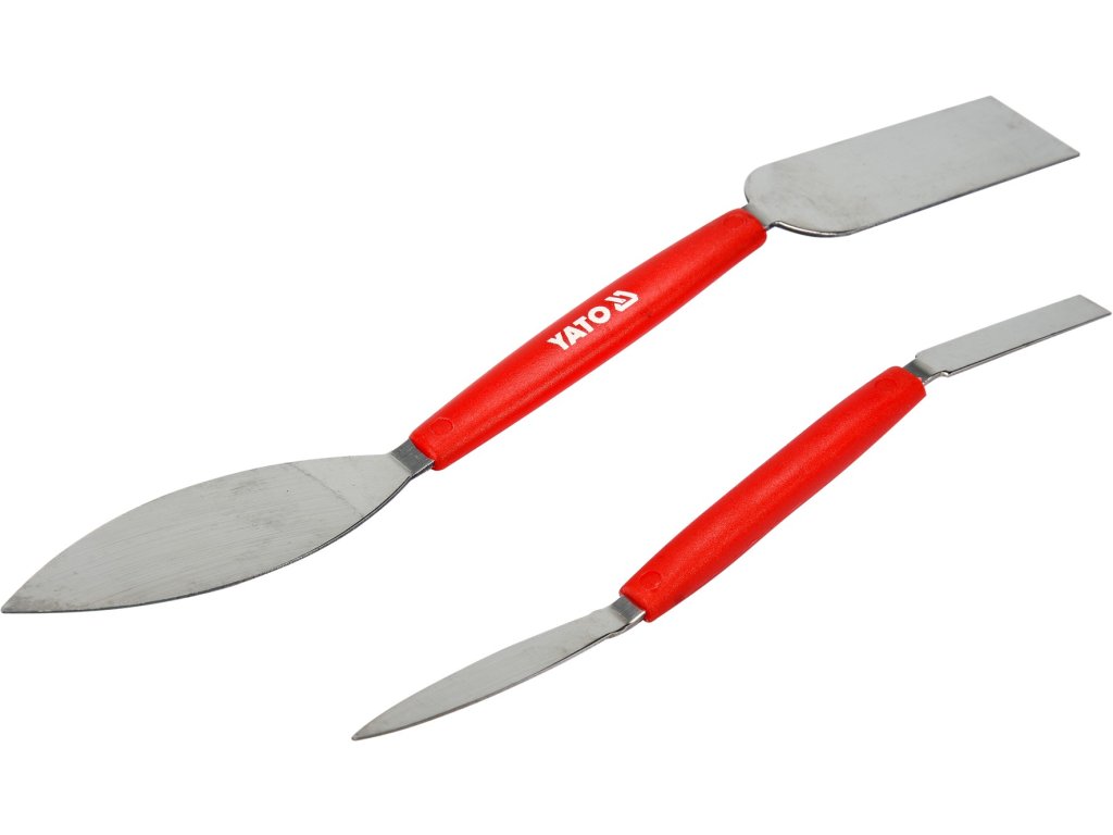 Sada oboustranných špachtlí ve tvaru listu a obdélníku s plastovou rukojetí.