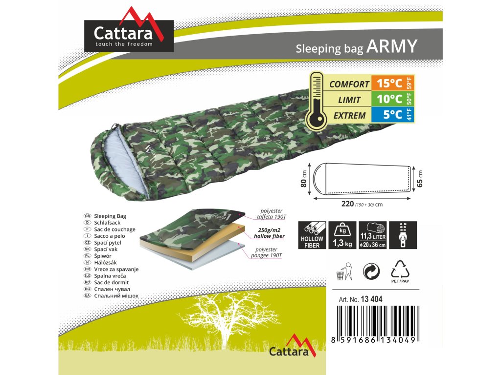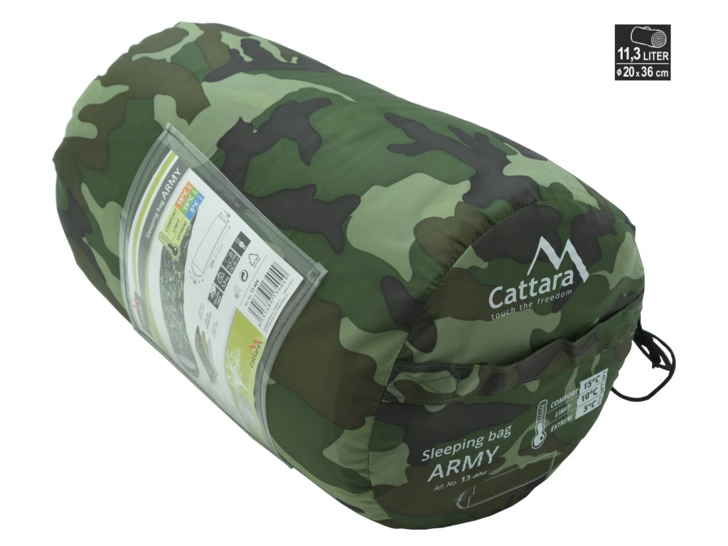 Nejširší uplatnění však najde jako lehce přenosný spacák, to je zajištěno jeho malými rozměry v balení pouhých 20 x 36 cm. Spacák Army je vybaven třemi vrstvami, vnější a vnitřní materíál je polyester taffeta 190T a izolační vrstva polyesterová dutá vlákna s gramáží 250g/m2.