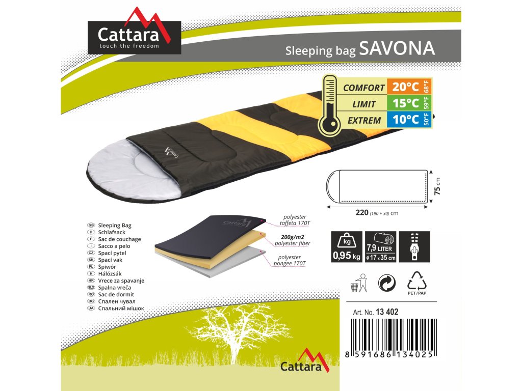 Nejširší uplatnění však najde jako lehce přenosný spacák, to je zajištěno jeho malými rozměry v balení pouhých 17 x 35 cm. Spacák Savona je vybaven třemi vrstvami, vnější a vnitřní materíál je polyester taffeta 170T a izolační vrstva polyesterové vlákno s gramáží 200g/m2.