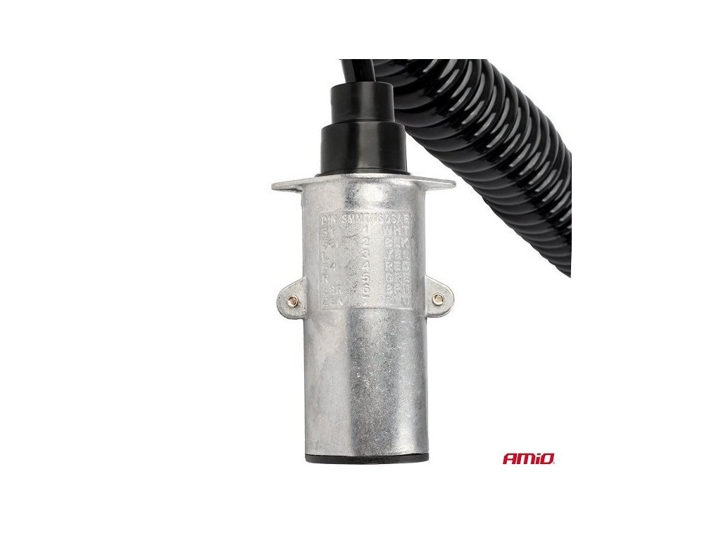 Spirálový kabel pro přívěs TIR 2x 7pinový typ N 5m 24V AMIO Odolný a spolehlivý spirálový kabel pro přívěsy, vybavený dvěma 7pinovými konektory typu N, určený pro instalace 24 V. Pracovní délka 5 metrů zajišťuje flexibilní spojení mezi tahačem a přívěsem, a toi při plně otočené soupravě.Kabel je vysoce odolný vůči povětrnostním podmínkám, oděru a natahování, což zaručuje dlouhou životnost a bezproblémový provoz. Pevné konektory vyrobené z odolných materiálů zajišťují spolehlivé a stabilní elektrické připojení v souladu s evropskými normami.
