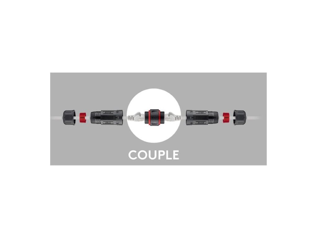- Jednoduše rozšroubovat , provléknout patch kabely, zasunout do vnitřní spojky RJ45 a zpět pouzdro vodotěsně sešroubovat