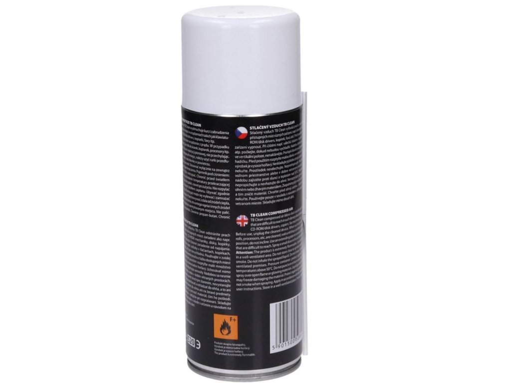 Sprej stlačený vzduch, TB Clean 400ml TB Clean stlačený vzduch je vynikajícím pomocníkem pro odstranění prachu a nečistot z těžko dostupných míst u zařízení, jako jsou klávesnice, tiskárny, kopírky, DVD mechaniky a další. Upozornění: Výrobek je vysoce hořlavýManuál k produktu je ke stažení zde