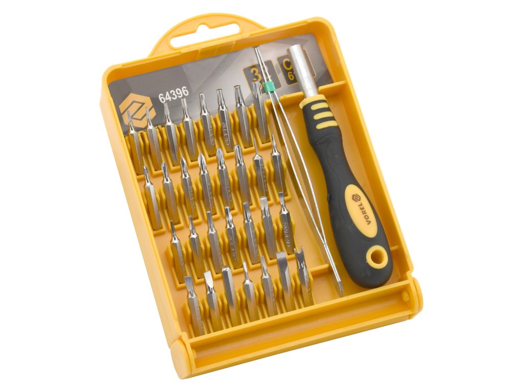 Obsahuje celkem 32ks dílů: nejdrobnější bity různých provedení z kvalitní Cr-V oceli, kvalitní, ergonomický šroubovák a pinzetu.