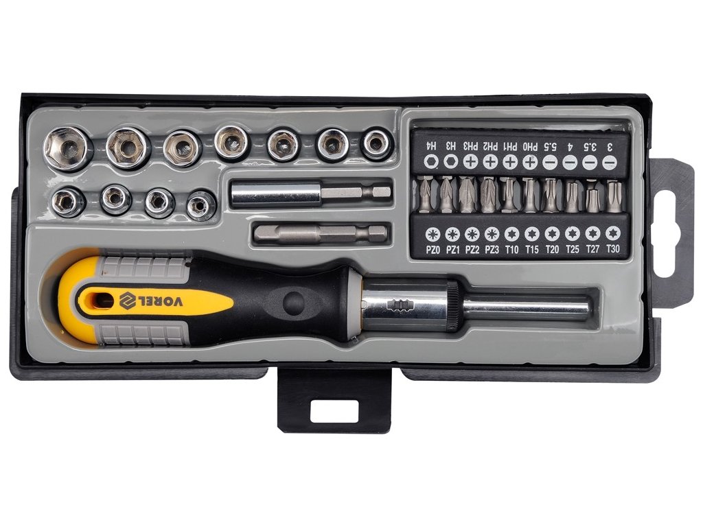 Šroubovák ráčnový sada 36ks. Vyrobené z kvalitní oceli CrV6150.Tato sada obsahuje velké množství vyměnitelných šroubováků, rukojeť s ráčnou z měkčeného plastu s protiskluzovou vrstvou a magnetický nástavec. Vše uložené v přehledné a praktické krabičce.