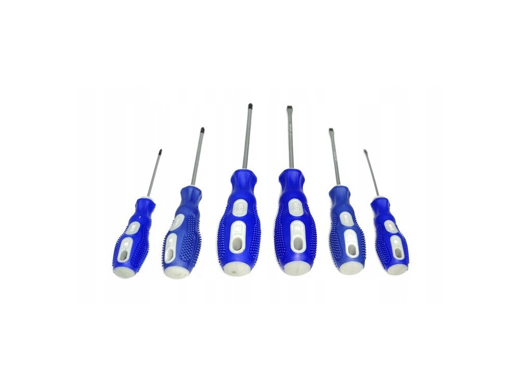 Obsahuje tři ploché šroubováky (4×75 mm, 5×125 mm, 6×150 mm) a tři křížové šroubováky (PH4×75 mm, PH5×75 mm, PH6×100 mm).