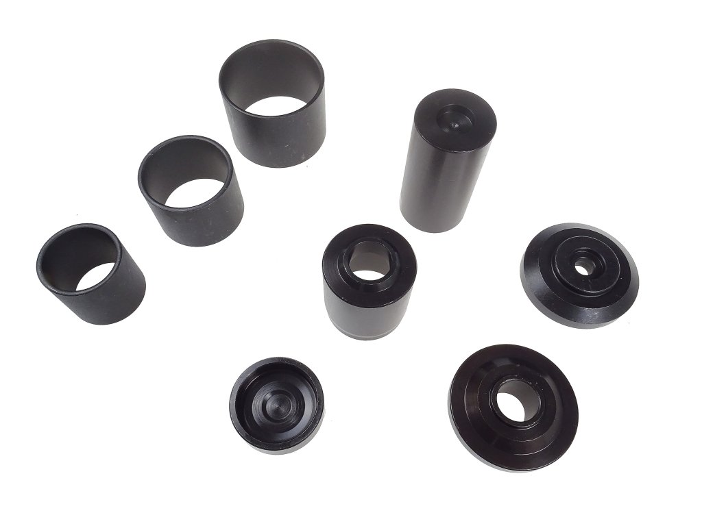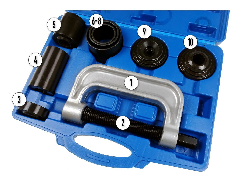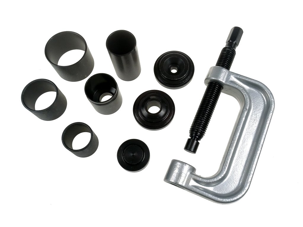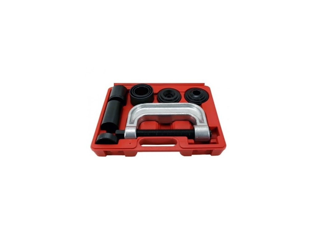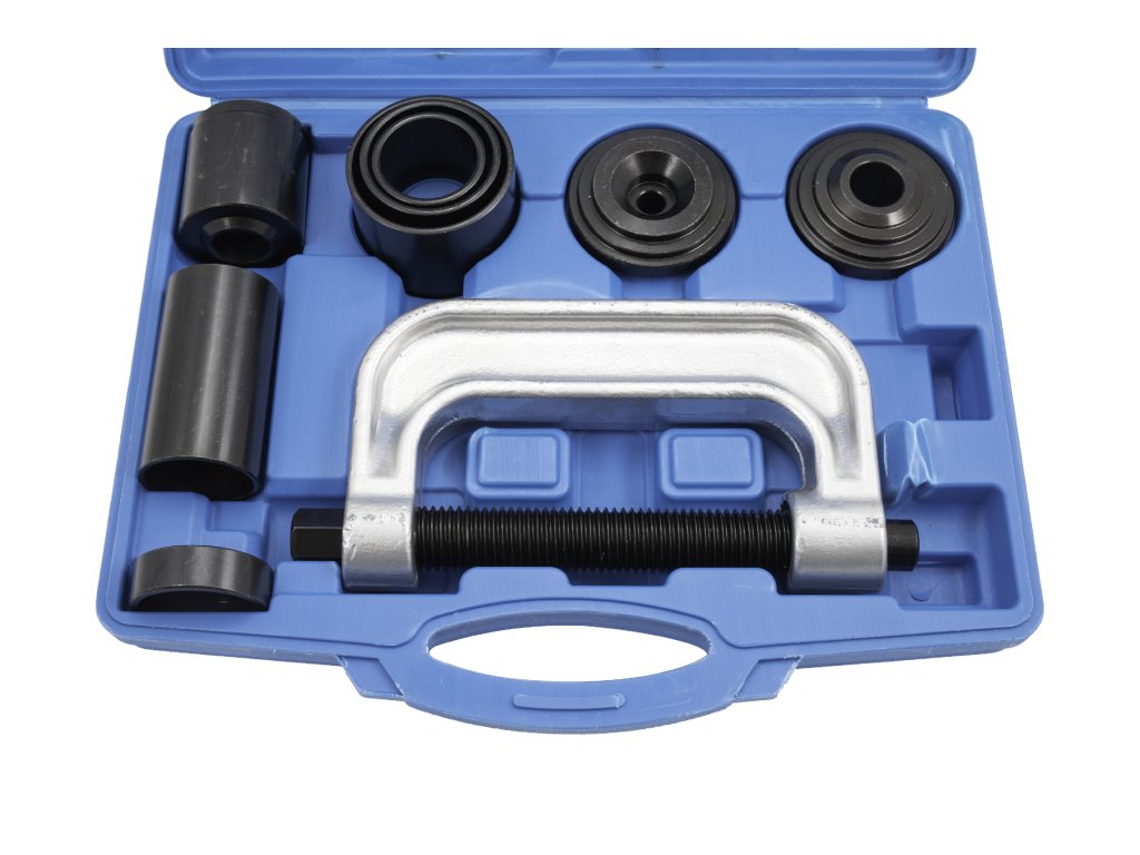 Šroubovací lis slouží k demontáži a montáži čepů, kloubů a brzdových čelistí. Sada obsahuje masivní lis s bytelnou závitnicí a osm různých nástavců k vytlačování a zatlačování čepů různých velikostí.