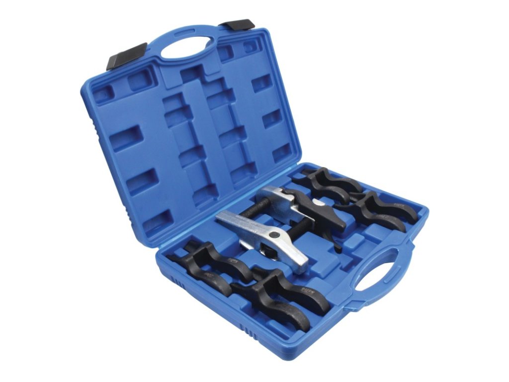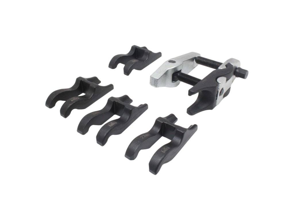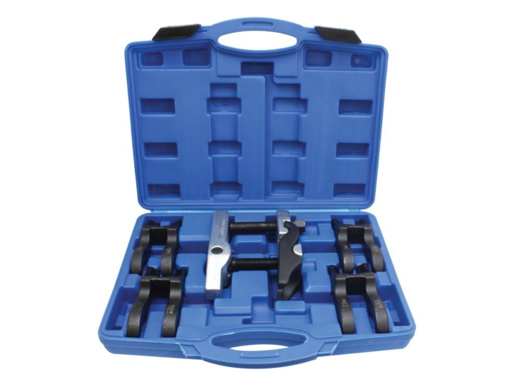 Profesionální sada nářadí navržená pro rychlou a efektivní demontáž kulových čepů různých velikostí. Obsahuje univerzální stahovák s vyměnitelnými vidlicemi o průměrech 20, 22, 24, 27 a 30 mm, což zajišťuje kompatibilitu s širokou škálou osobních a užitkových vozidel.