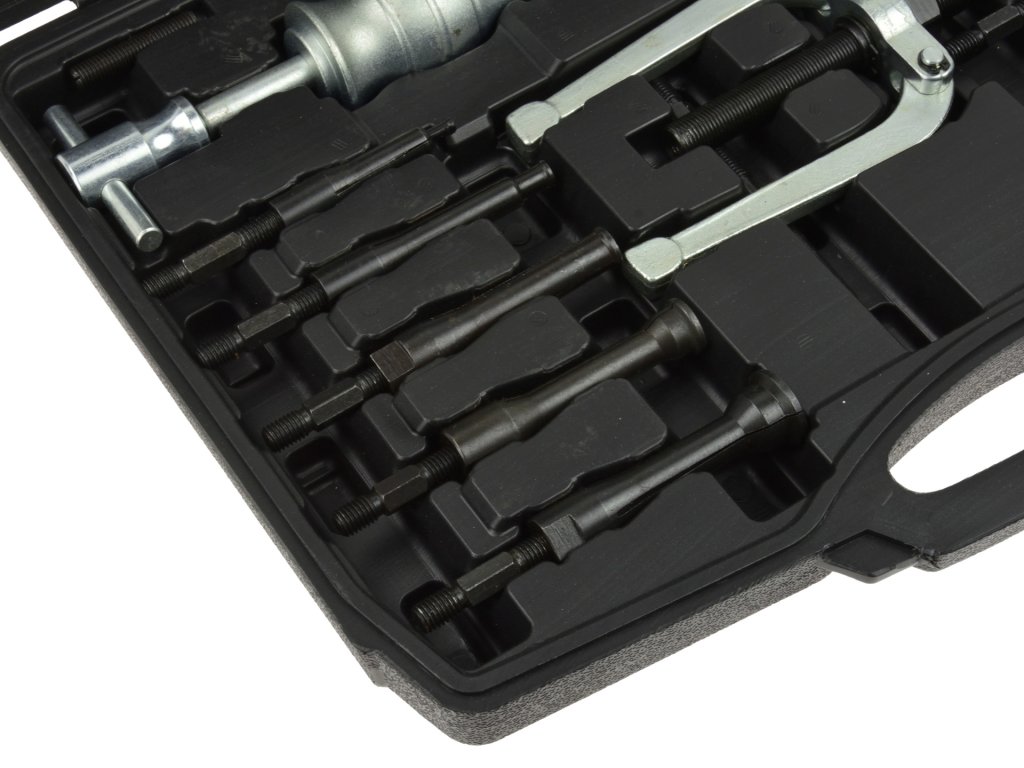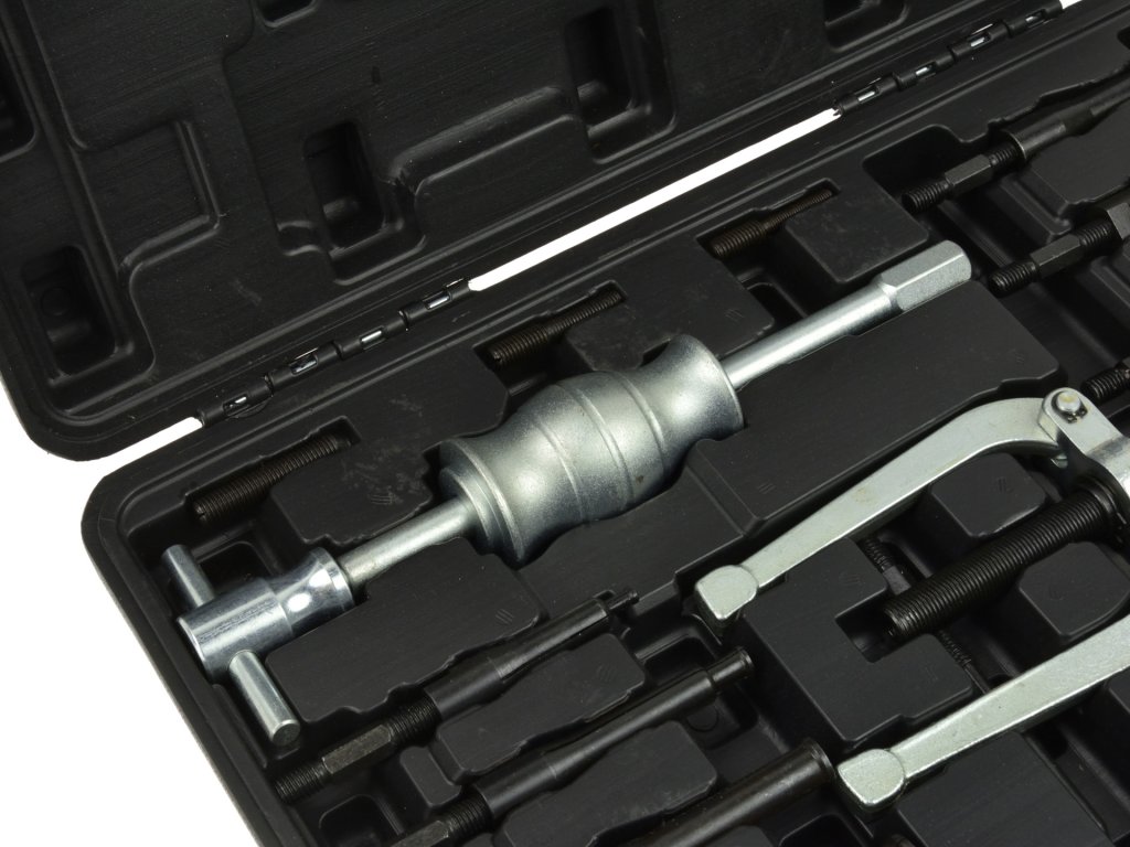 Stahovák pro těsně uložená ložiska a pouzdra, sada nástrojů přehledně uspořádaná v kufru. Pracovní rozsah v rozmezí 8-58 mm.