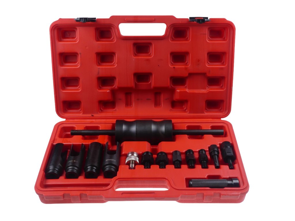 Sada obsahuje 14 kusů přípravků na demontáž vstřikovačů paliva, včetně zakarbonovaných a jinak problematických vstřiků. Sada se skládá z adaptérů, speciálních nástrčných hlavic, reverzního (kluzného) kladiva, a kloubu pro snazší práci v omezeném prostoru motorového prostoru. Nářadí je vyrobeno z kalené oceli.