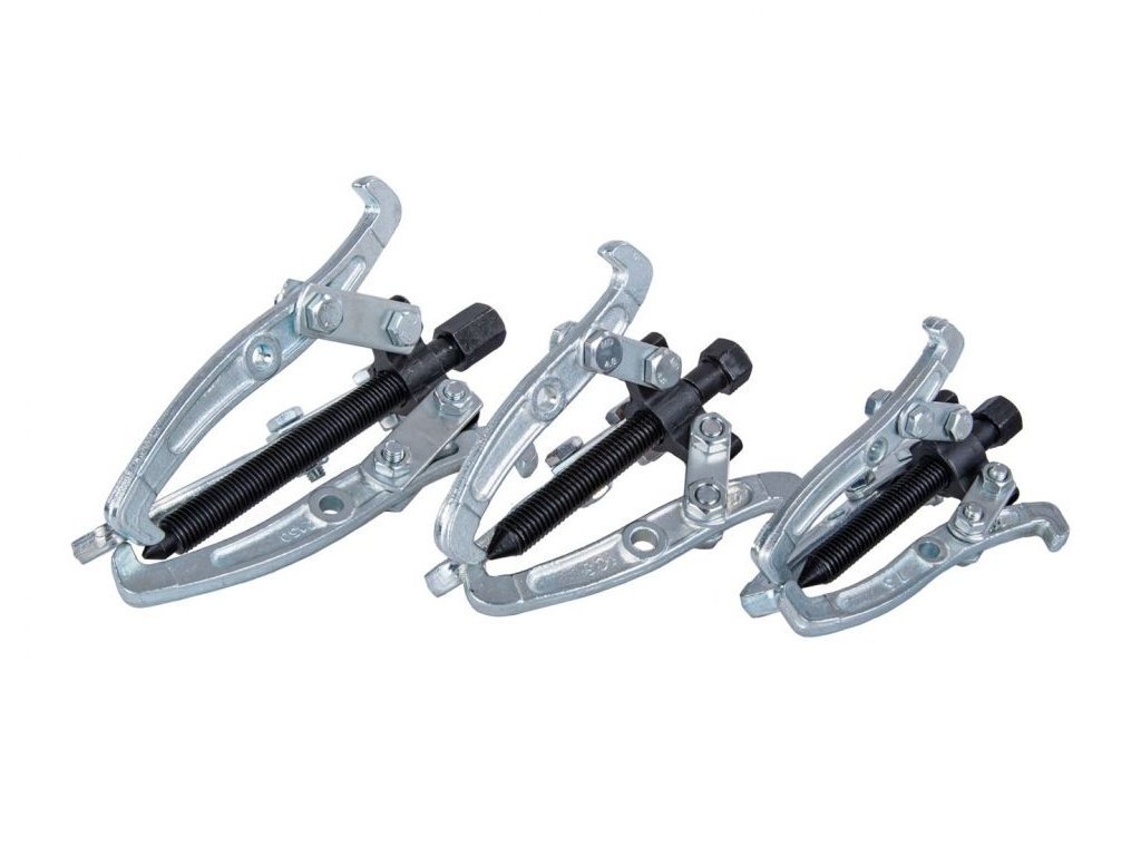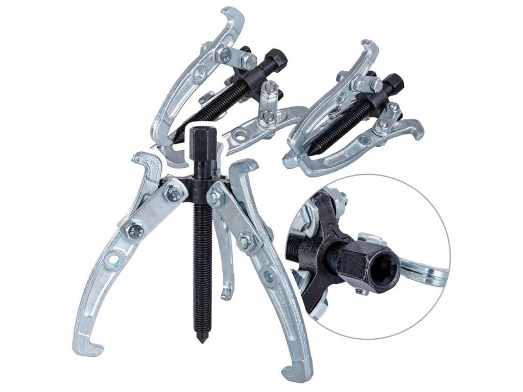 Stahováky tříramenné v sadě 3 ks obsahují tříramenné stahováky 85 mm, 105 mm a 150 mm. Tyto nástroje jsou ideální pro demontáž ložisek, rotorů, brzdových kotoučů, řemenic a dalších komponentů pevně usazených na osách. Sada obsahuje stahováky různých velikostí, což umožňuje flexibilitu a přizpůsobení konkrétnímu úkolu