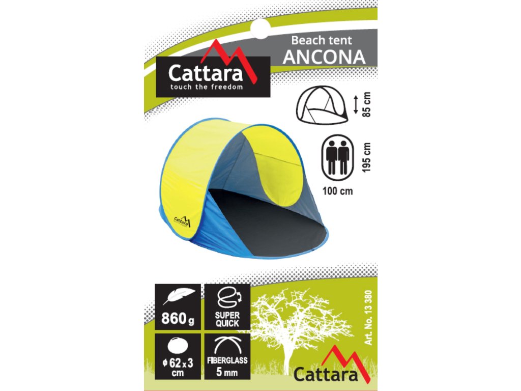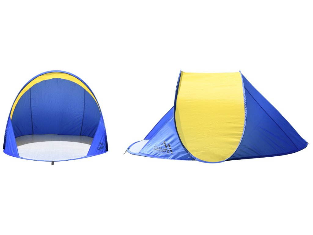 Plážový samorozkládací stan o rozměrech 120 x 195 x 85 cm, vhodný na místa kde je potřeba vyvtořit stín ve slunečném letním počasí, např. pláže a zahrady.
