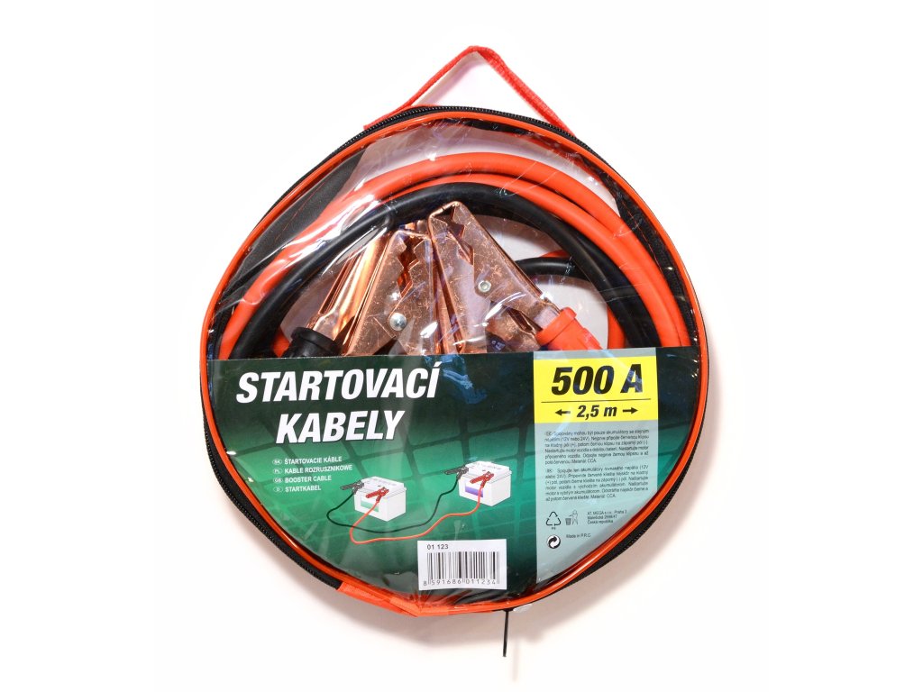 Klasické startovací kabely, barevně označené, se svorkami na akumulátor. Uzavíratelné balení, snadné uložení startovacích kabelů zpět do praktického, na zip uzavíratelného, obalu.