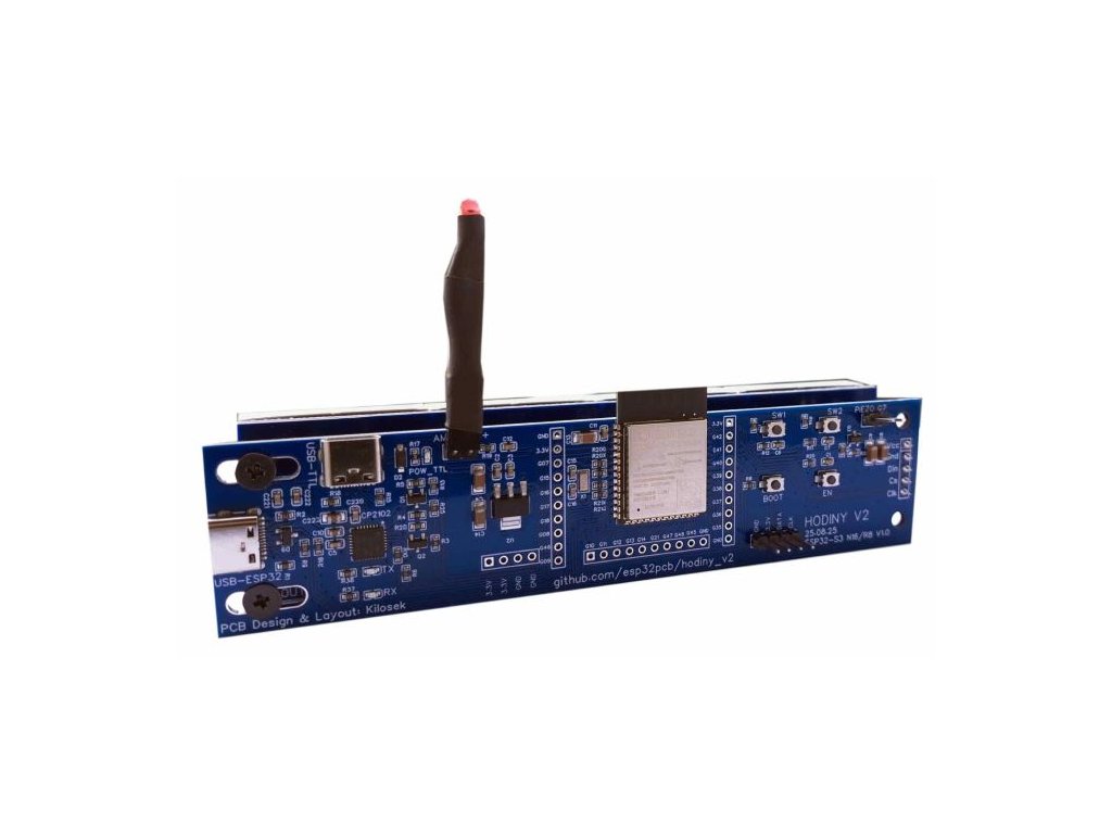 Stavebnice hodiny s ESP32-S3 a MAX7219 - verze2 rozměry 135×37×34mmStavebnice představuje modul digitálních hodin které jsou řízené pomocí internetu. Čas získávají pomocí SNTP. Běží na ESP32. Ukazují čas, datum, svátky, (teplotu a vlhkost). WIFI si Nastavíte si jednoduše pomocí mobilu. Možnost nastavit stopky 0-99s po 1 milisekundě**specifikace:**