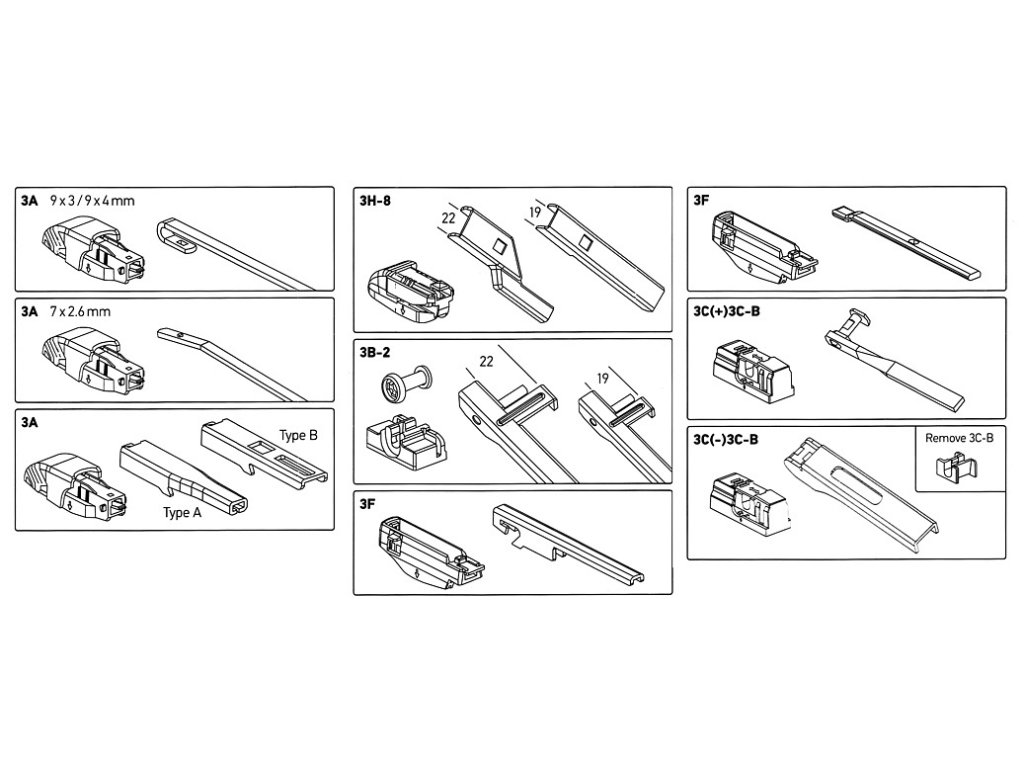 Balení zároveň obsahuje celou řadu adaptérů, díky kterým je možné stěrač použít na všechny běžná zakončení ramínek stěračů.