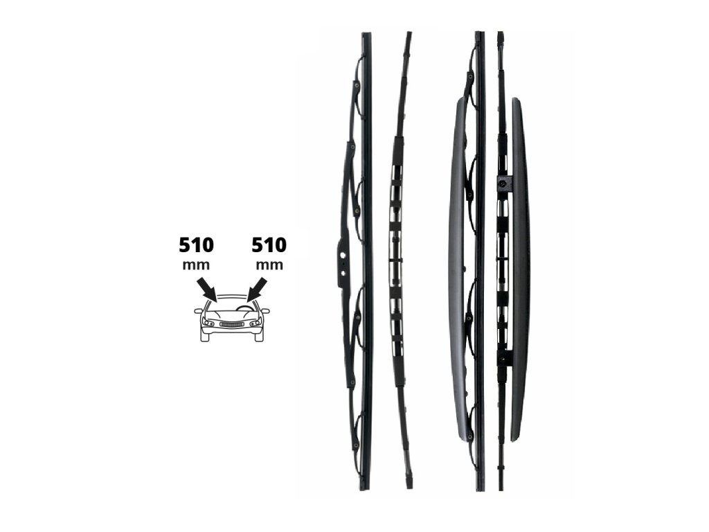 Sada dvou stěračů (řidič + spolujezdec), optimalizovaná pro vozy Škoda Felicia. Stěrač určený k montáži před řidičem se spoilerem. Stěrač určený k montáži před spolujezdcem je prohnutý. Zajišťuje dokonalé stírání i na zakřivené části skla na straně spolujezdce. Kvalitní vícevahadlová nýtovaná konstrukce ramena stěrače. Balení obsahuje stěrač se spoilerem 510 mm (20") + stěrač 510 mm (20") + univerzální adaptéry pro montáž.