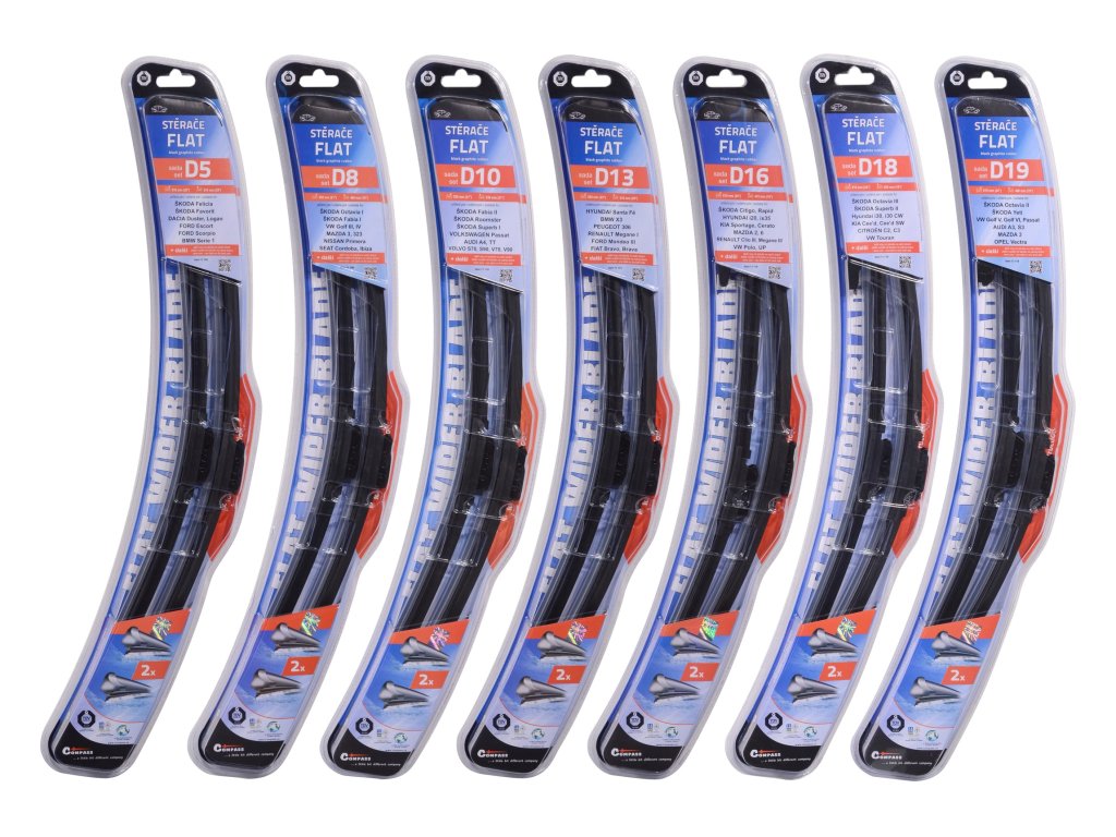 Sady dvou plochých stěračů FLAT (řidič + spolujezdec) s řadou adaptérů pro různá zakončení ramen stěračů.