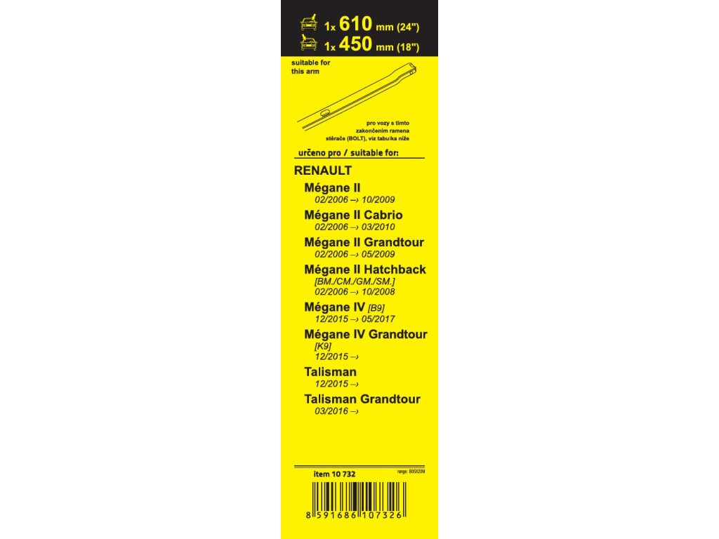 Sada dvou plochých stěračů FLAT (řidič + spolujezdec) se speciálním uchycením. Délky stěračů a systém uchycení na ramínko jsou přizpůsobeny vybraným vozům (viz tabulka použití).