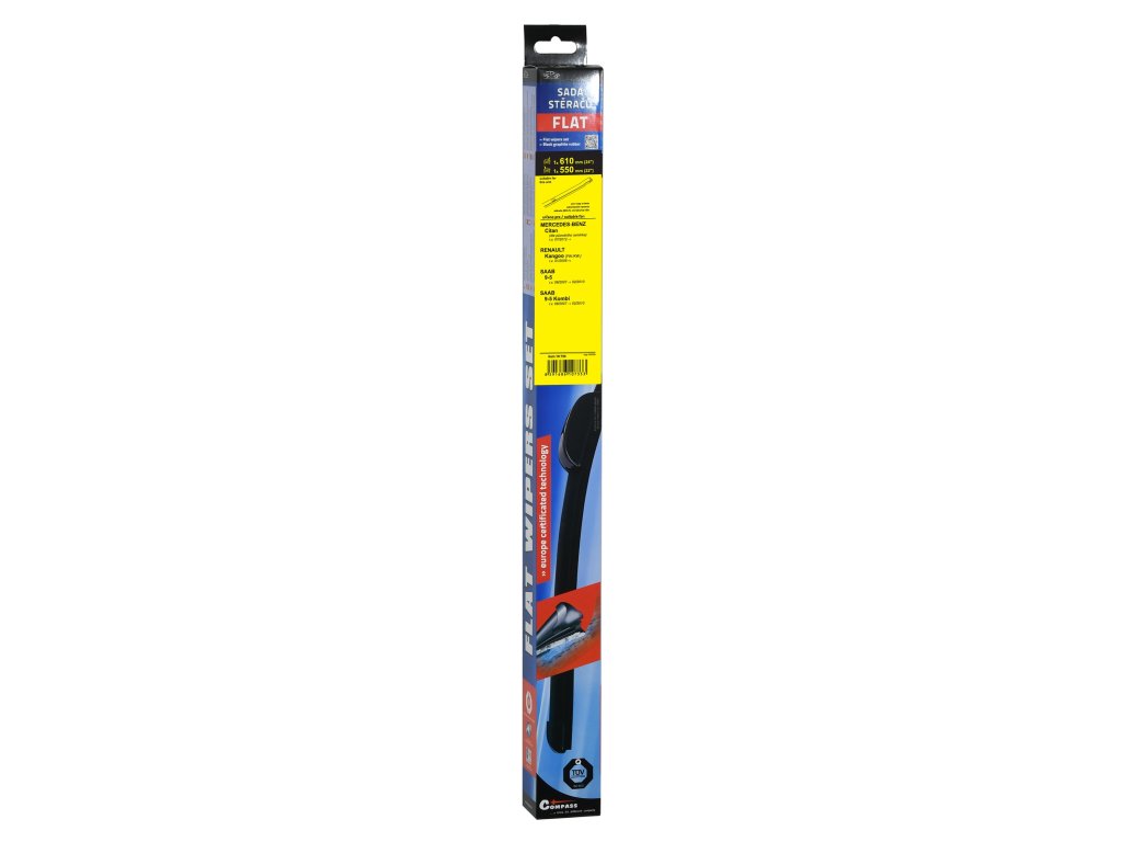 Sada dvou plochých stěračů FLAT (řidič + spolujezdec) se speciálním uchycením. Délky stěračů a systém uchycení na ramínko jsou přizpůsobeny vybraným vozům (viz tabulka použití).