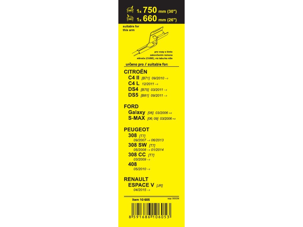 Sada dvou plochých stěračů FLAT (řidič + spolujezdec) se speciálním uchycením. Délky stěračů a systém uchycení na ramínko jsou přizpůsobeny vybraným vozům (viz tabulka použití).