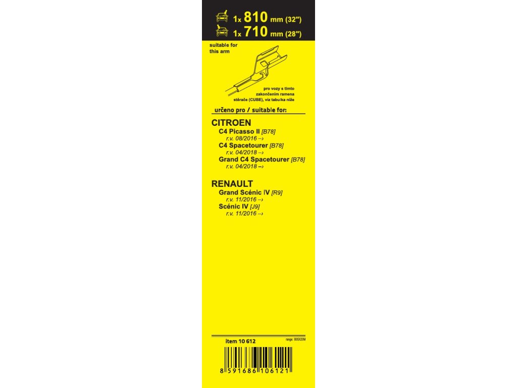 Sada dvou plochých stěračů FLAT (řidič + spolujezdec) se speciálním uchycením. Délky stěračů a systém uchycení na ramínko jsou přizpůsobeny vybraným vozům (viz tabulka použití).