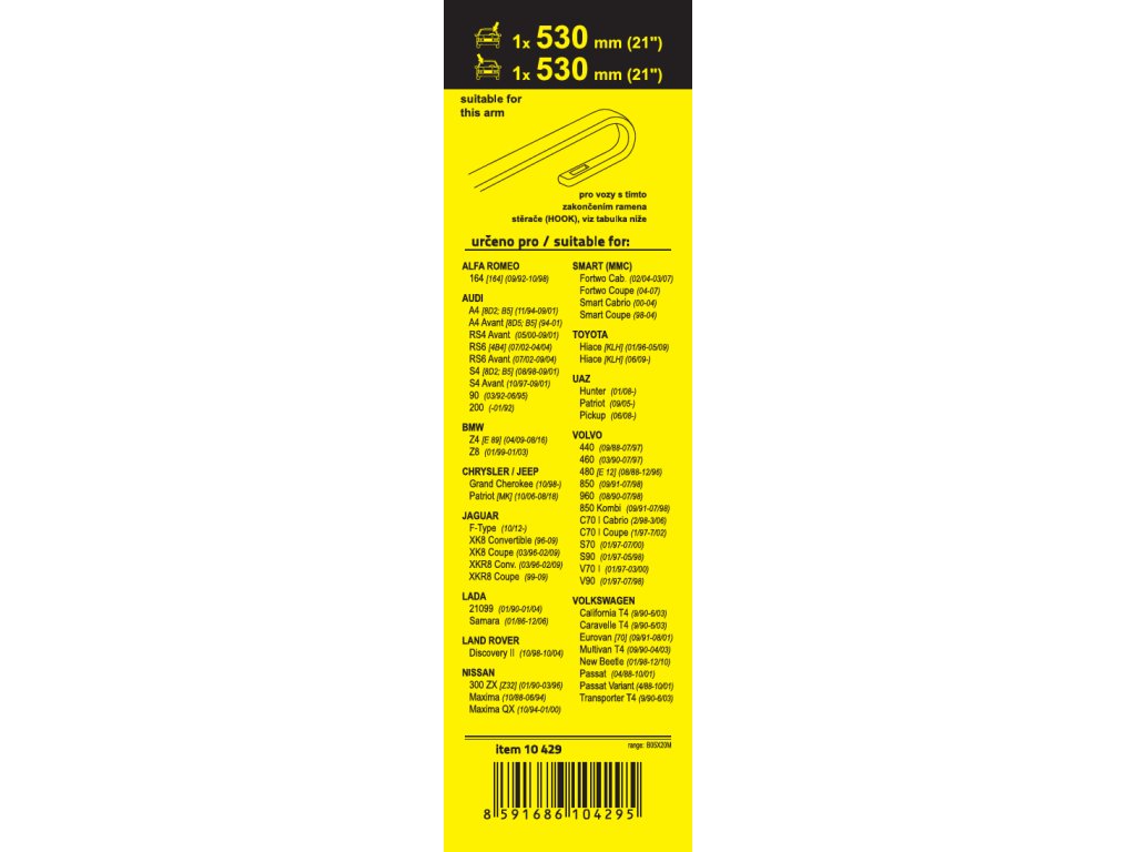 Sada dvou plochých stěračů FLAT (řidič + spolujezdec) se speciálním uchycením. Délky stěračů a systém uchycení na ramínko jsou přizpůsobeny vybraným vozům (viz tabulka použití).