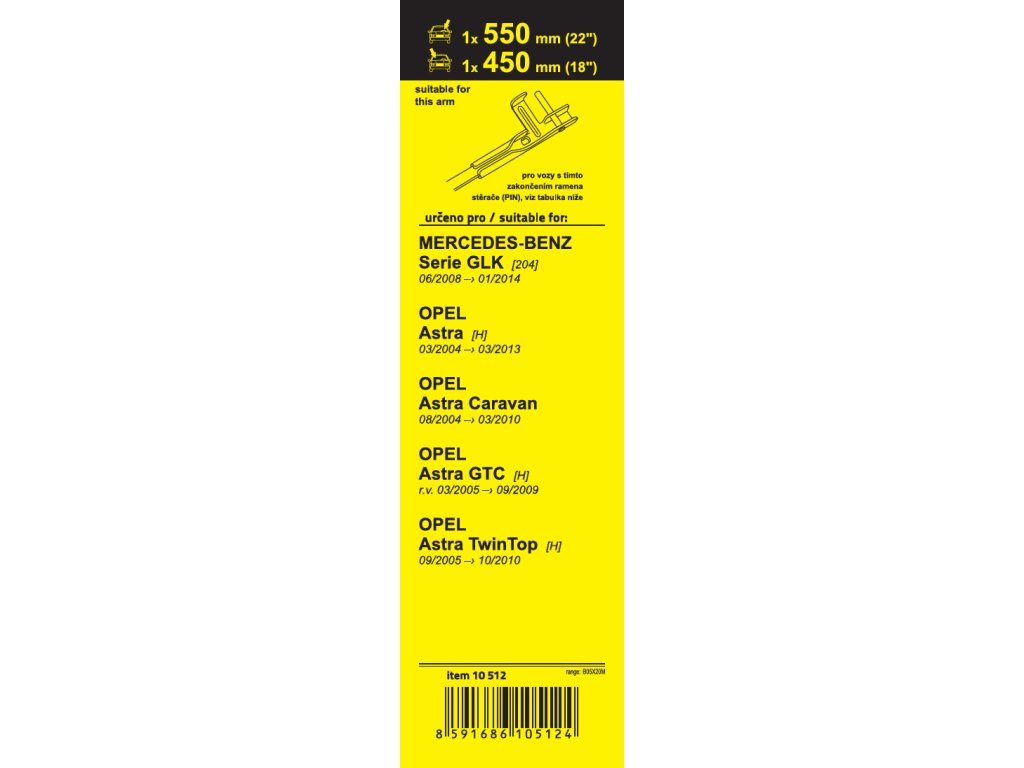 Sada dvou plochých stěračů FLAT (řidič + spolujezdec) se speciálním uchycením. Délky stěračů a systém uchycení na ramínko jsou přizpůsobeny vybraným vozům (viz tabulka použití).