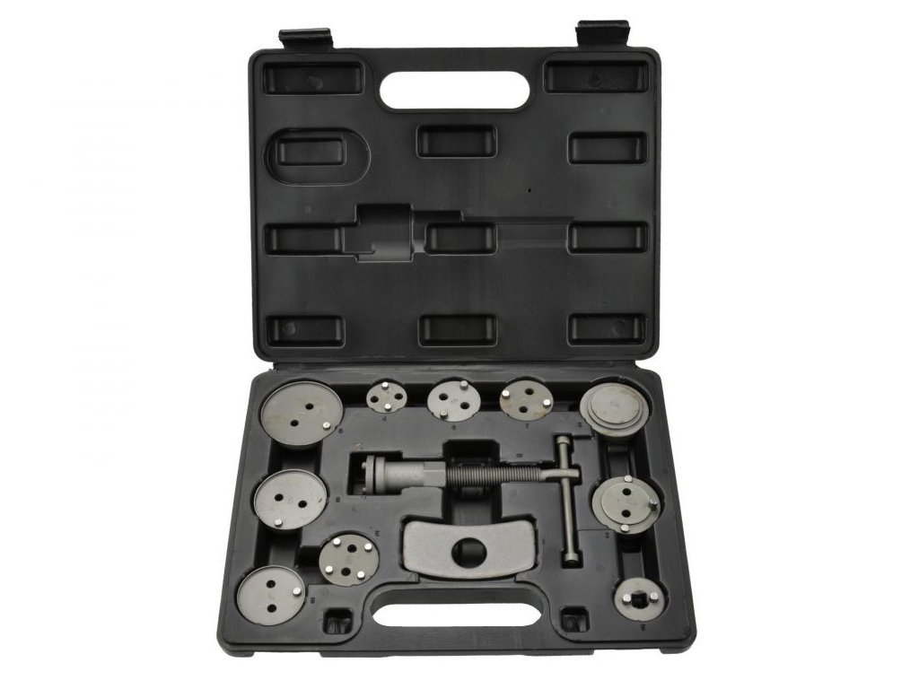 Univerzální sada v plastovém kufru slouží pro montáž/zpětné vracení pístů/třmenů kotoučových brzd.