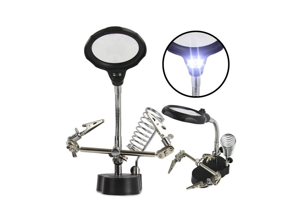 2xLED podsvícení - napájeno 3x AAA bateriemi (nejsou součástí balení). Má spirálový držák páječky a stabilní základnu. Po demontáži ramen lze lupu použít samostatně, např. ke čtení. Díky volným rukám vám sada umožní volně provádět takové práce jako: lepení, pájení, opravy.
