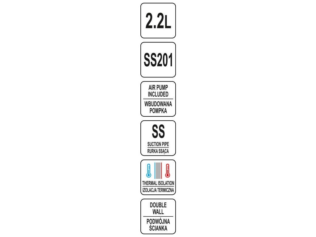 Termoska je vybavena čerpadlem, které usnadňuje přesné nalévání nápojů. Na druhé straně je sací trubice vyrobena z nerezové oceli, což umožňuje udržovat ji bezvadně čistou bez nadměrného úsilí. Termoska YATO je také vybavena ochranou proti odkapávání, která zabraňuje rozlití nápojů. Praktická plastová rukojeť usnadňuje přepravu termosky.