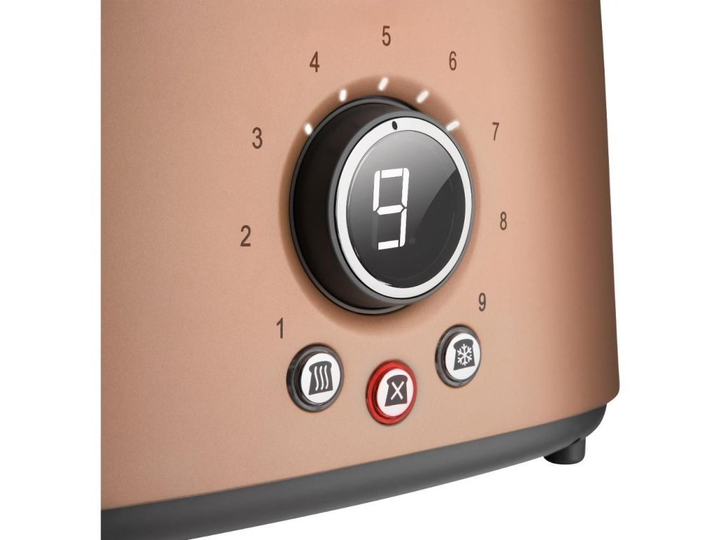 Vše snadno navolíte pomocí ovládání na přední straně topinkovače, které je navíc obohaceno o LED displej s indikátorem provozu. Přehledně tak vidíte stupeň intenzity opékání a zvolený program.