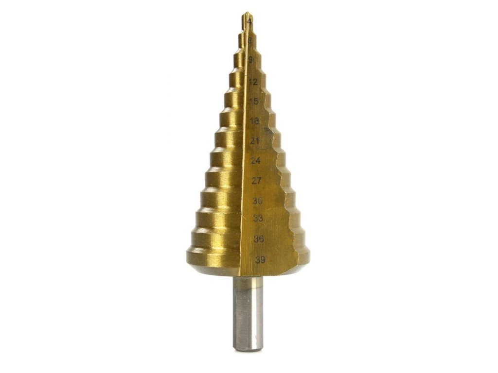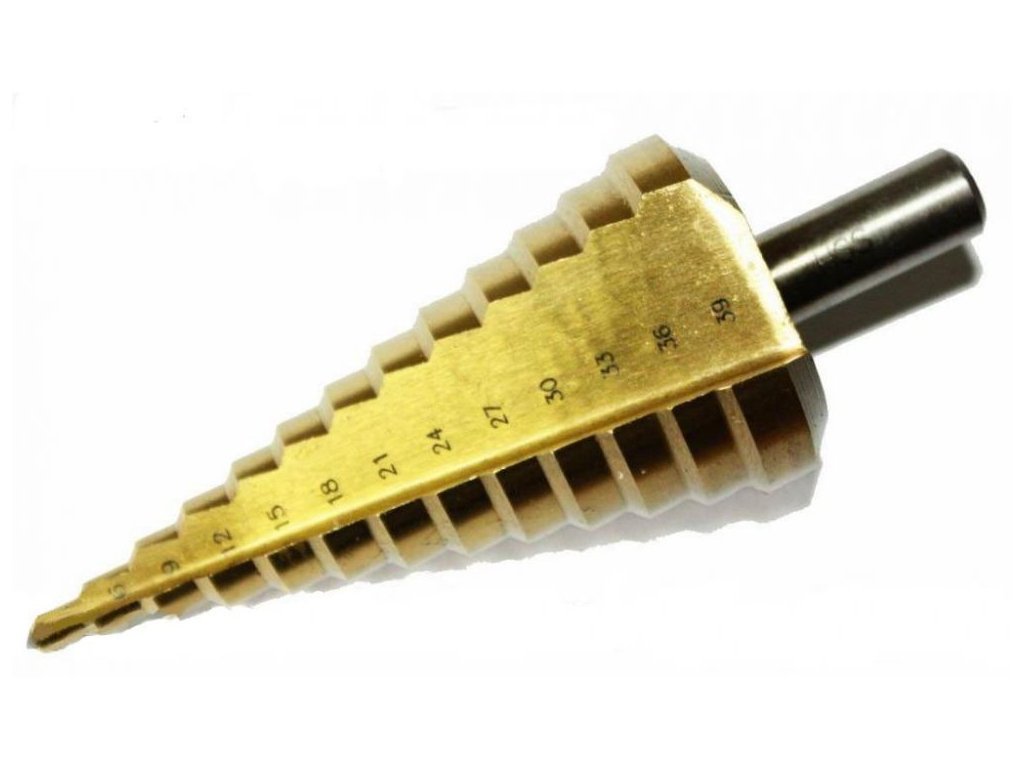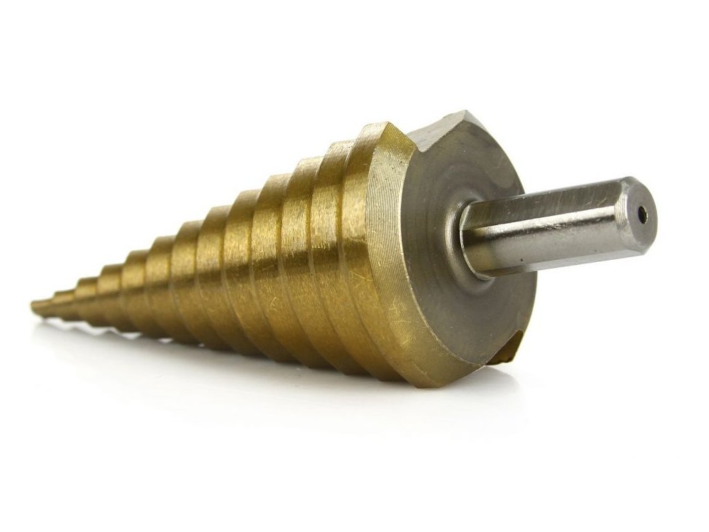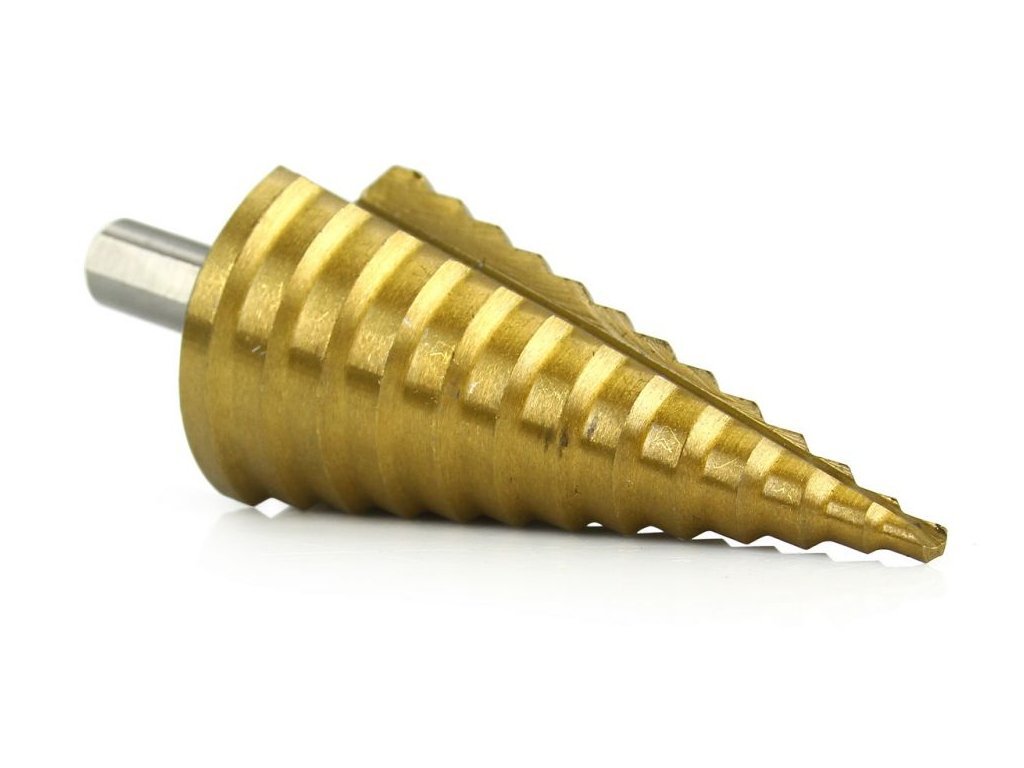 Velmi kvalitní stupňovitý vrták vyrobený z vysoce kvalitní oceli HSS+TITAN vhodný do kovů, plechů, plastů apod.