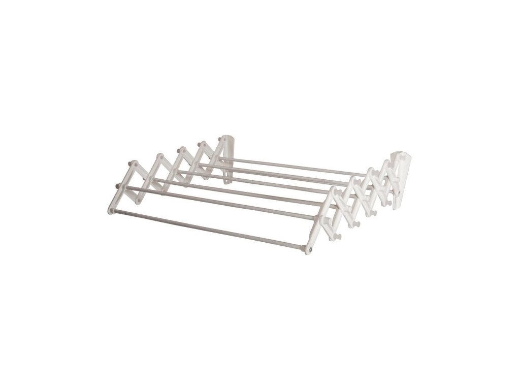 Klasický roztahovací harmonikový sušák.7 ocelových tyčí potažených plastem.