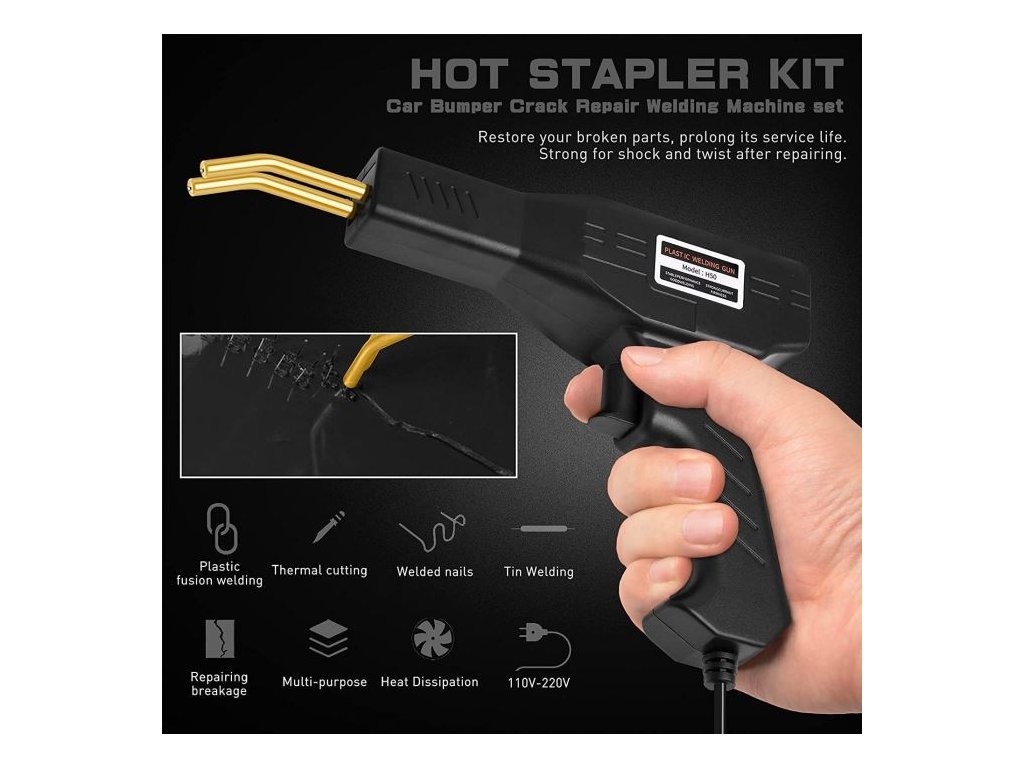 Svářecí pistole na plast H50, 600 svařovacích drátků Sada pro opravy plastových dílů, svařování plastů a maskování případných prasklin.Sada obsahuje svířecí pistoli s LED přísvitem a 600 ocelových spon na plast (4 druhy po 150 ks)